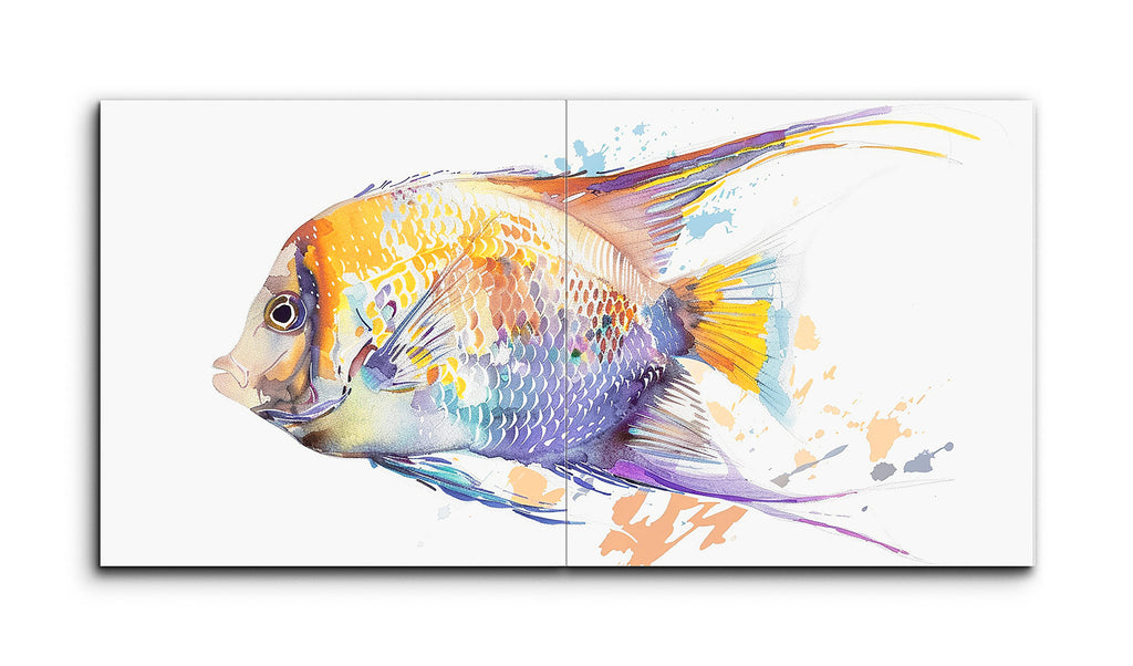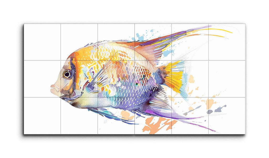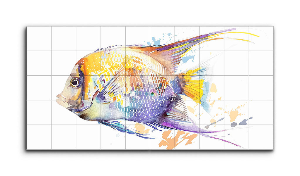 This tile mural showcases a vibrant fish, possibly an angelfish or discus, in a dynamic blend of realism and abstraction. The fish, oriented horizontally with its head to the left, features detailed scales and fins, while a vivid palette of oranges, yellows, purples, and blues creates a watercolor-like effect. Expressive splashes and drips suggest movement, giving the impression of the fish swimming through a colorful, energetic underwater scene. The balanced composition highlights the lively spirit and diverse beauty of aquatic life.