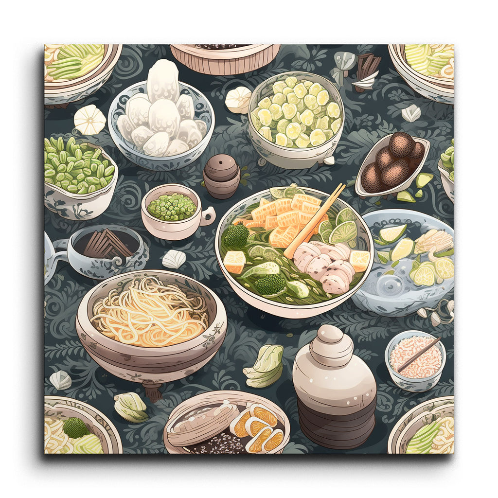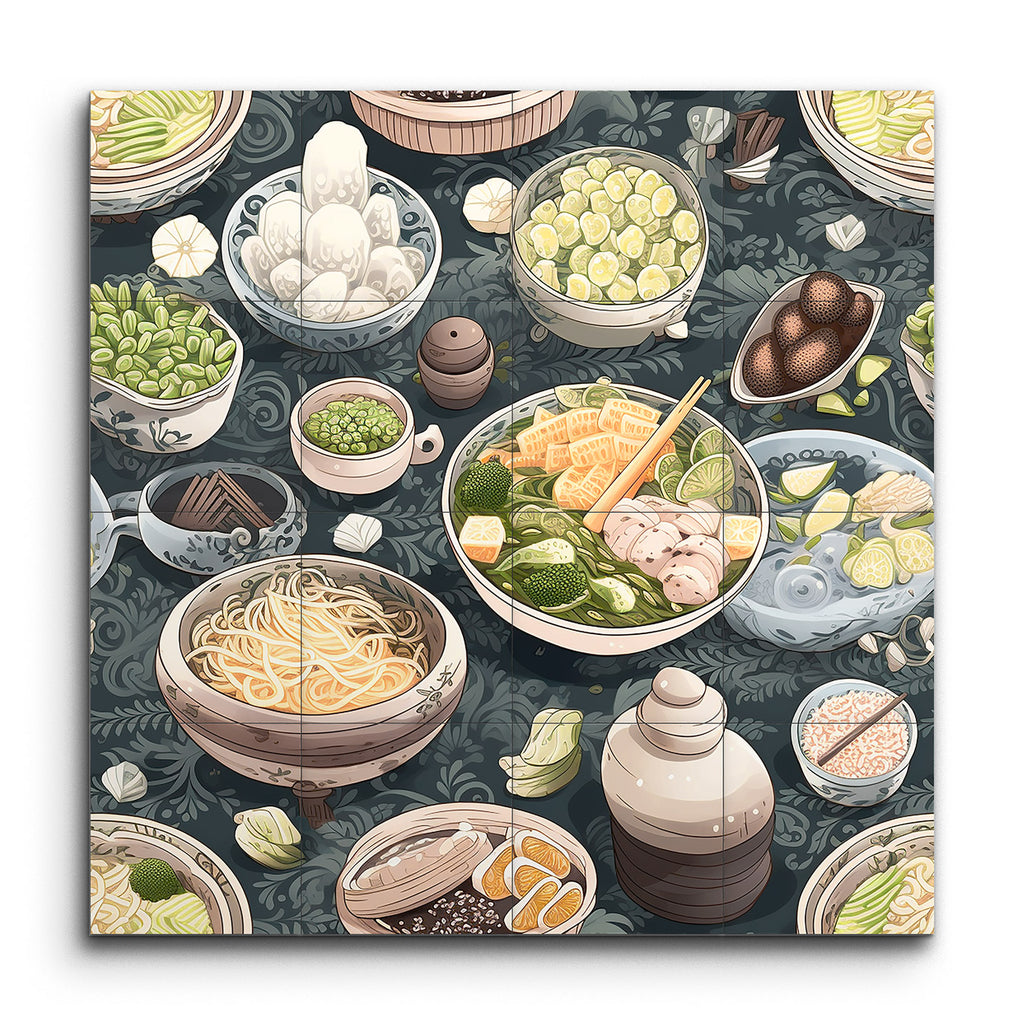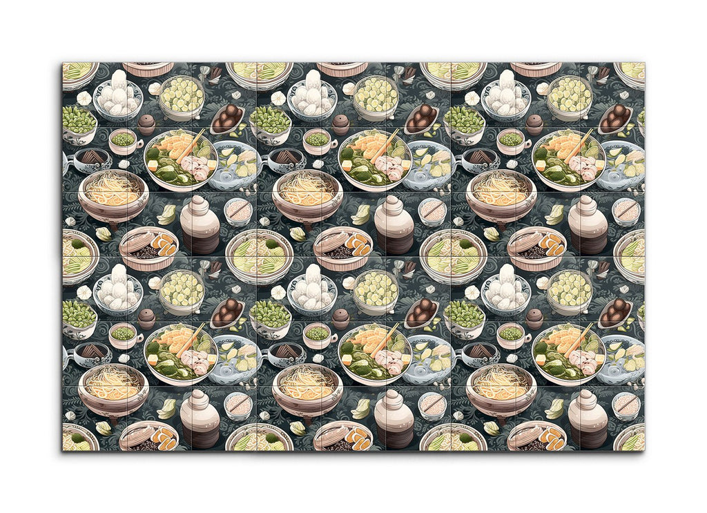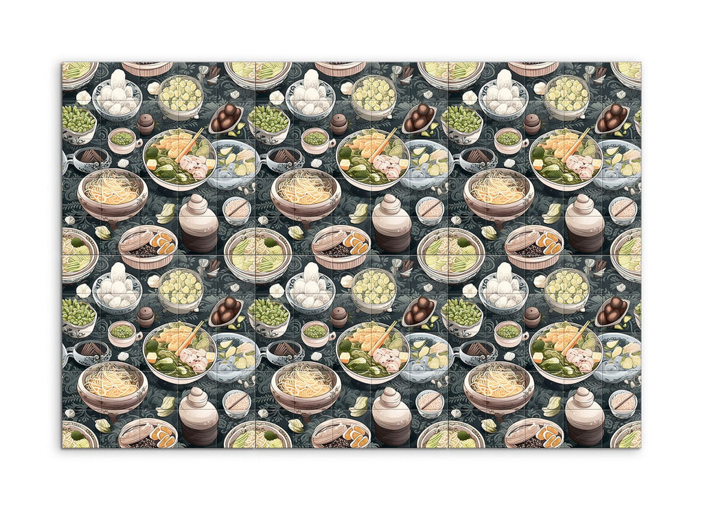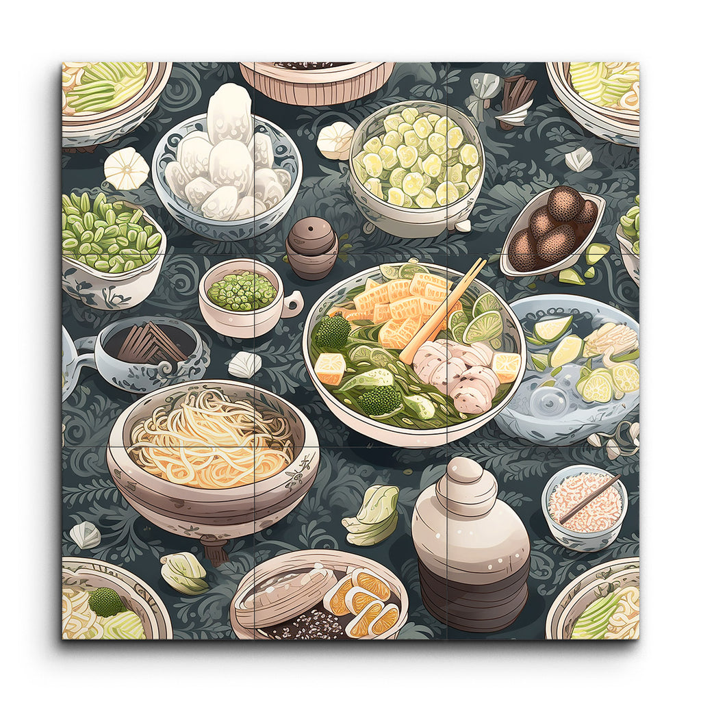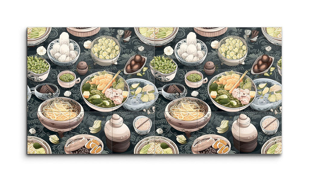 Transform your space with a vibrant tile mural featuring a detailed and playful illustration of Asian cuisine. This modern, cartoonish artwork captures an overhead view of a delightful array of dishes, including intricately detailed bowls of noodles, appetizing dumplings, and colorful vegetables like bok choy and broccoli. The rich color palette and clean lines highlight the textures and forms of the food, set against a dark, leafy background that adds depth and sophistication. Perfect for food lovers and art enthusiasts alike!
