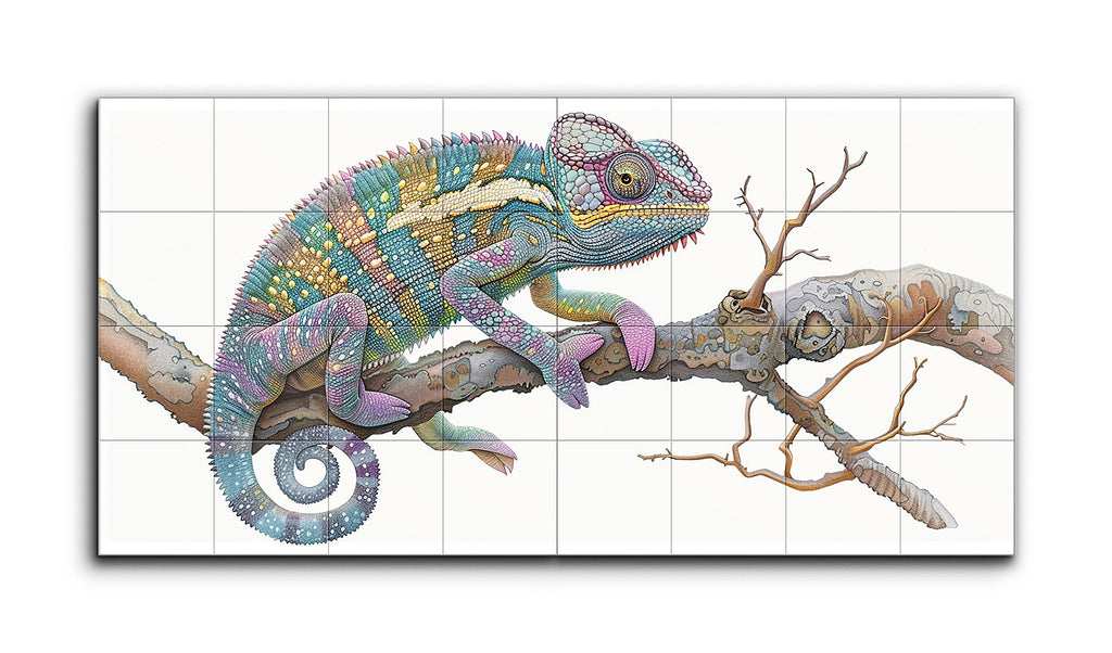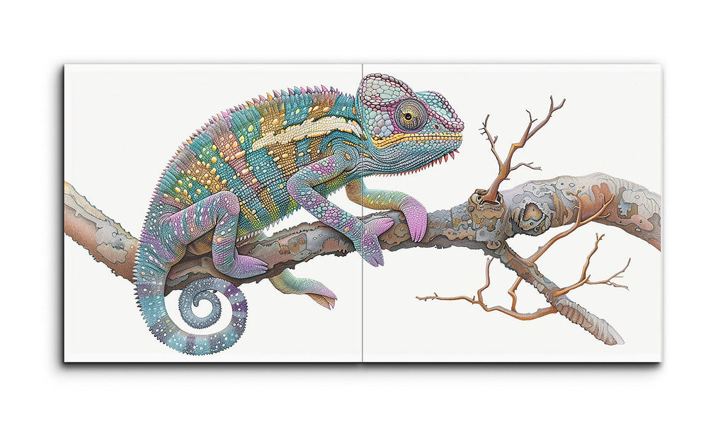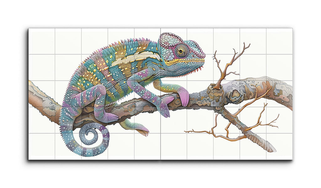 This diptych tile mural showcases a chameleon perched on a branch, rendered with meticulous detail and vibrant colors. The chameleon's intricate patterns span shades of green, blue, purple, pink, yellow, and orange, creating a textured, almost beaded appearance. Its expressive eye and three-dimensional scales add depth and curiosity. The branch, depicted with earthy tones and detailed bark, contrasts the chameleon's vivid hues, enhancing the overall hyperrealistic and fantastical quality of the artwork.
