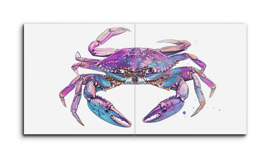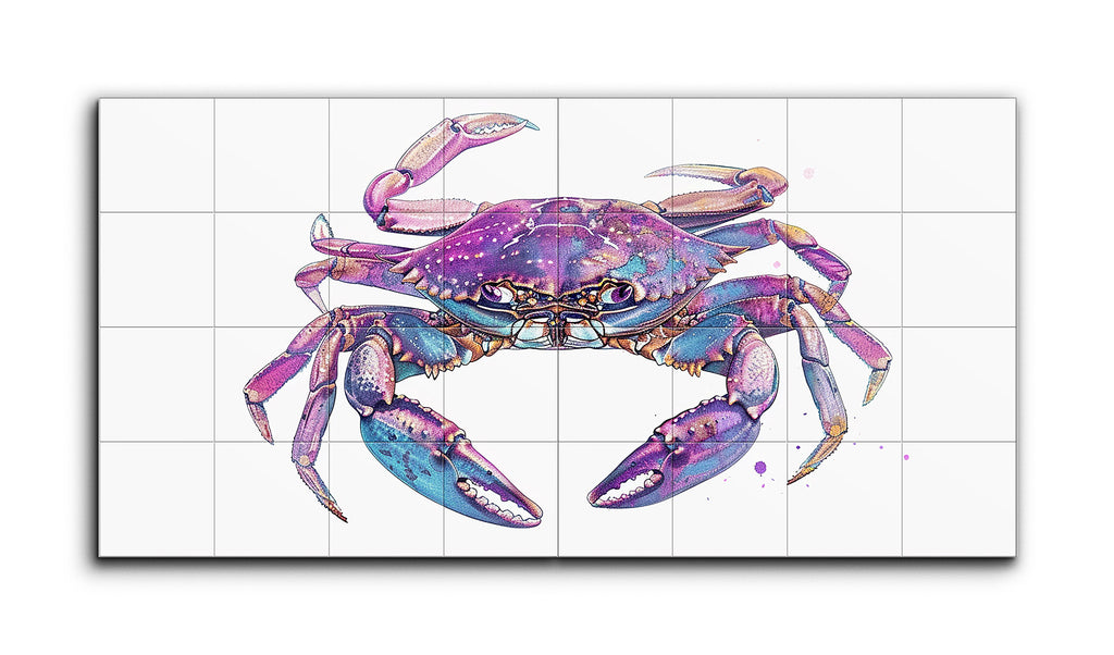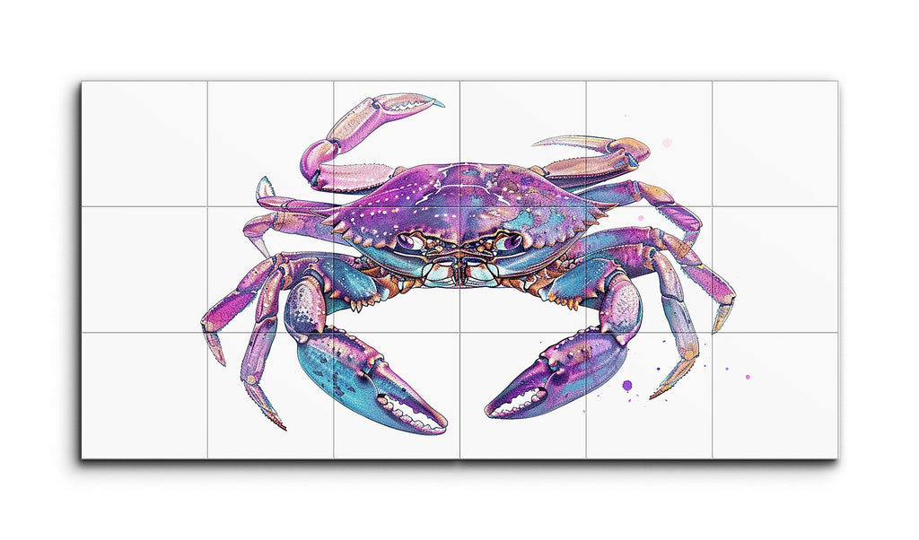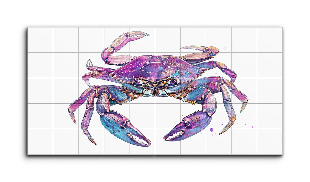 This two-panel tile mural showcases a semi-realistic crab, split down the middle where the panels meet. Emphasizing vibrant colors and intricate details, the crab is depicted in shades of purple and blue, with touches of pink and lighter hues highlighting its claws and legs. The crab's dynamic posture, with poised legs and claws, suggests movement and life. The meticulous textural details and the energetic splatter effects blend realism with imaginative color use, creating a visually engaging and expressive artwork.