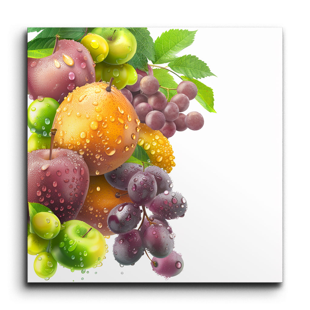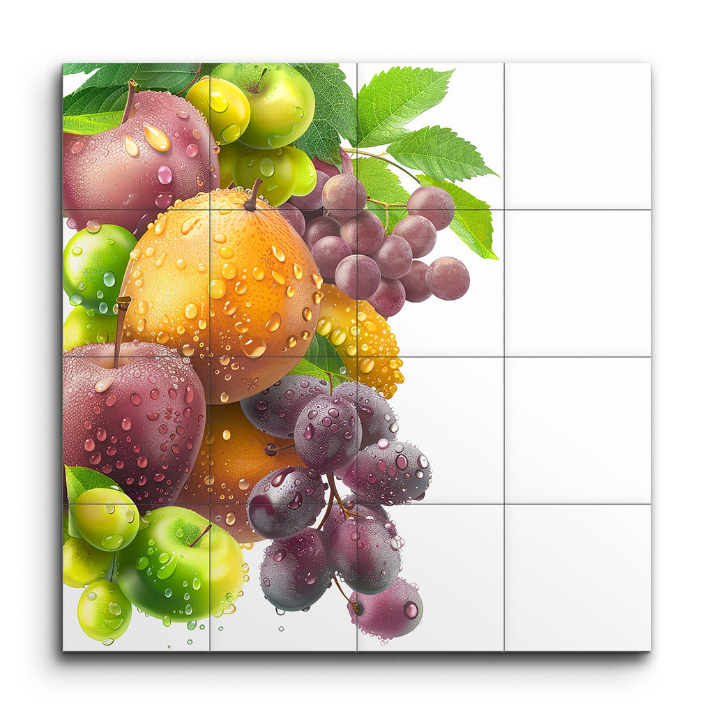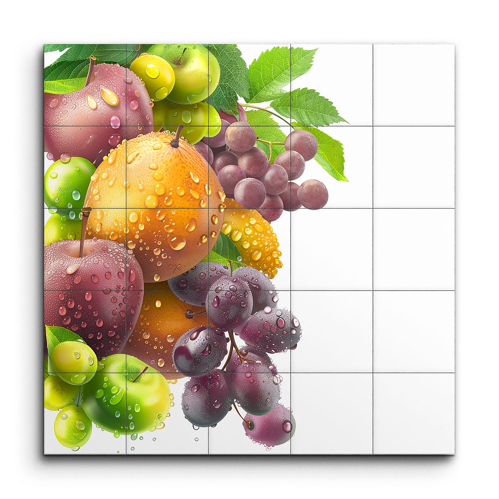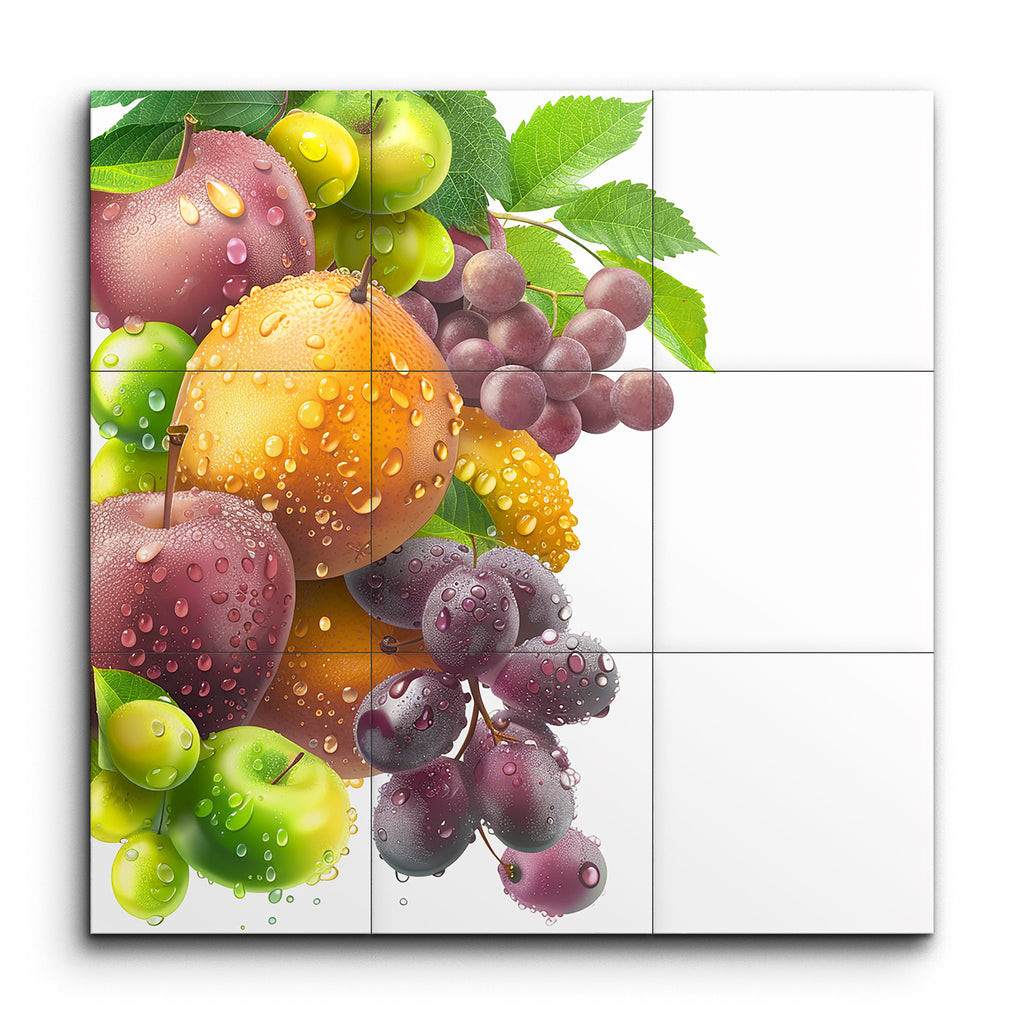 Transform your space with our stunning tile mural, featuring a hyper-realistic assortment of fruits that burst with vibrant colors and intricate details. Apples, grapes, plums, and oranges are depicted with lifelike textures and adorned with glistening water droplets, capturing their natural freshness. Lush green leaves weave through the composition, adding an organic feel. The meticulous play of light and shadow enhances the three-dimensional effect, making each fruit appear almost tangible. Perfect for adding a touch of nature's beauty to any room.