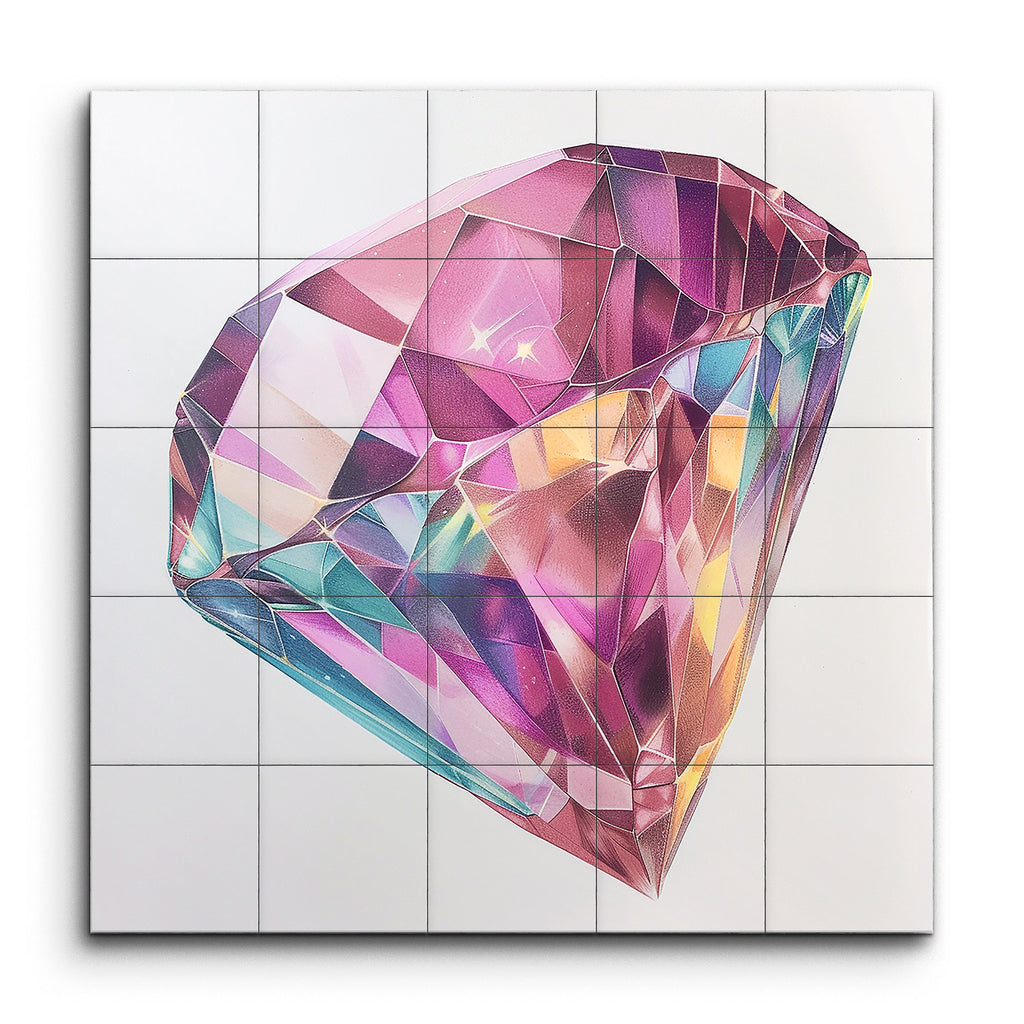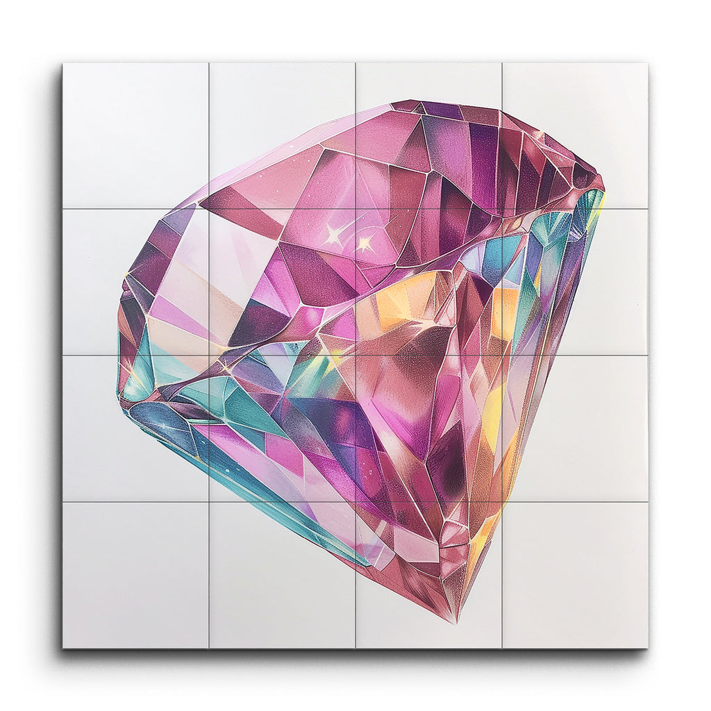 Introducing our stunning tile mural, showcasing a vibrant and highly detailed depiction of a gemstone, likely a diamond, rendered in a stylized, geometric fashion. The meticulously illustrated facets create a mesmerizing interplay of light and color, ranging from deep purples and pinks to bright yellows and blues. This modern, somewhat abstract piece emphasizes bold contrasts and dynamic gradients, enhancing its three-dimensional effect. Striking and visually engaging, it captivates with its intricate details and vibrant palette.