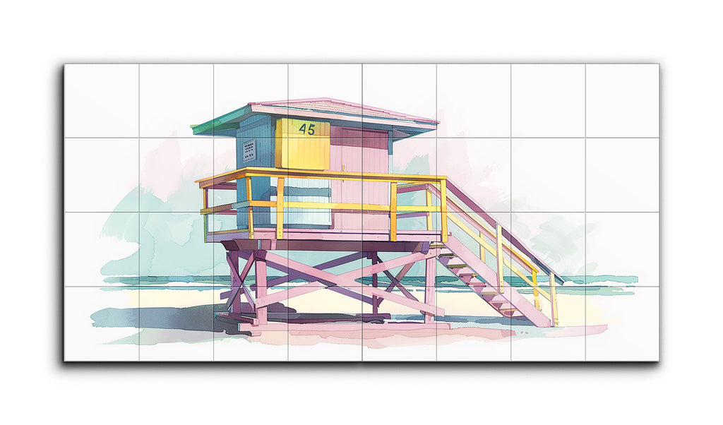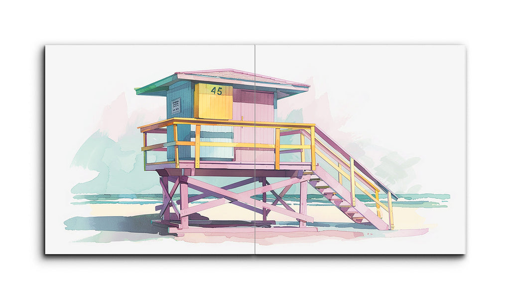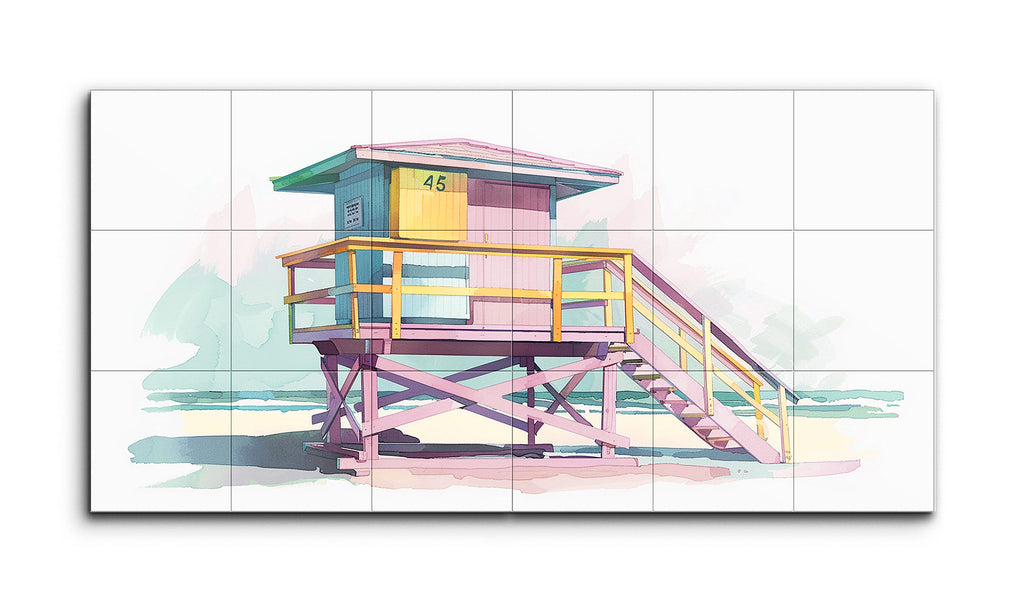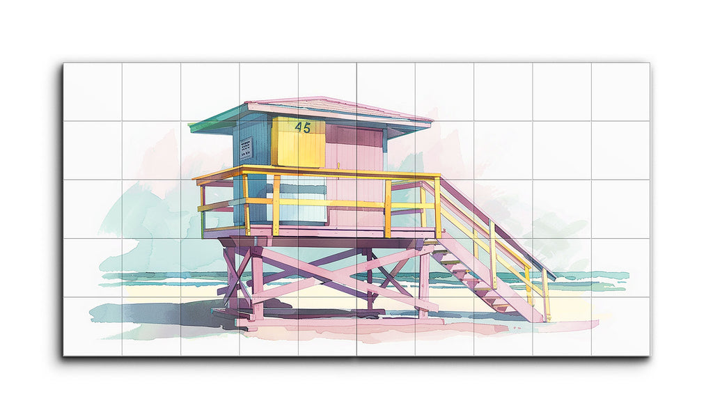 The artwork showcases a vibrant lifeguard tower in a modern, illustrative style. Elevated on purple crossbeams with a staircase leading up, the platform is enclosed by a railing in pink and yellow hues, evoking a sunny beach atmosphere. The hut atop is painted in teal, yellow, and pink with the number "45" displayed. The background features abstract shapes in gentle blues and greens, blending sea and sky seamlessly. The use of pastel colors and geometric forms creates a nostalgic, leisurely summer vibe.