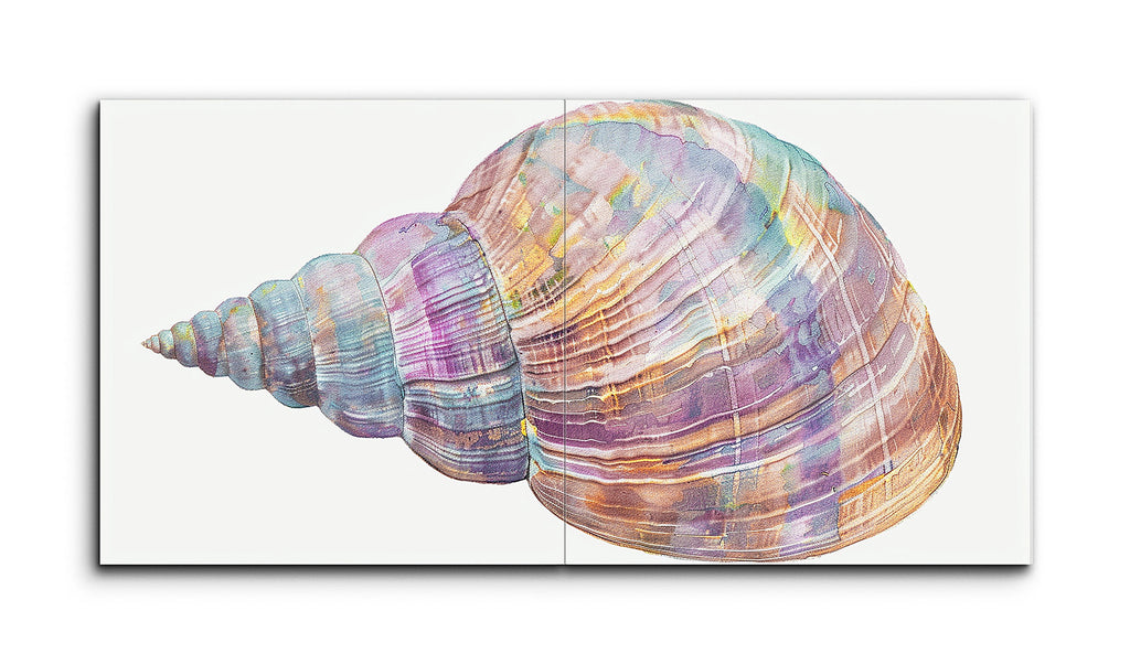 This tile mural features a highly detailed and vibrant illustration of a seashell, centrally positioned against a light background. The shell's spiral tip points left with the opening facing right. The artwork blends realism with impressionism, showcasing shades of purple, blue, pink, yellow, and orange. Visible brushstrokes add texture, while subtle light and shadow enhance its three-dimensionality. Each ridge and curve is meticulously rendered, capturing the essence and beauty of the shell.