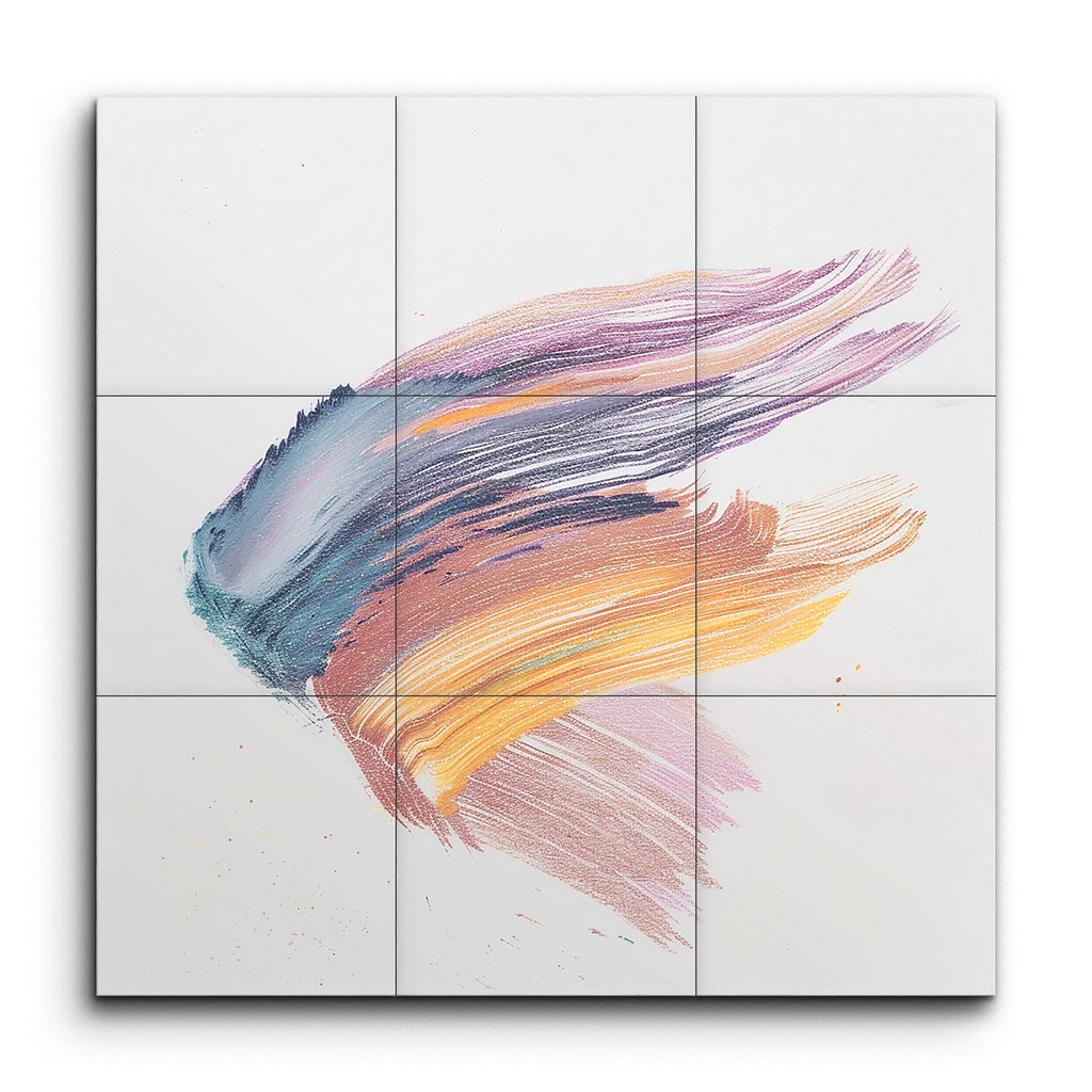 Transform your space with this captivating tile mural, featuring a dynamic, sweeping brushstroke that exudes movement and energy. The artwork transitions through a vibrant spectrum of colors—from dense, concentrated blues on the left, seamlessly blending into purples, pinks, oranges, and yellows on the right. Varied textures add depth, while soft, feathered edges enhance fluidity. This abstract, expressive piece brings a sense of unity and vibrant dynamism to any environment.