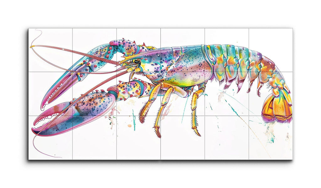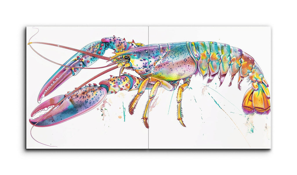 This diptych tile mural features a vibrant and stylized lobster, meticulously detailed with its segmented body, long antennae, and prominent claws. The creature is brought to life with a whimsical palette of pink, blue, purple, and yellow, applied in splatters, drips, and speckles. The dynamic use of color and flowing lines create a sense of movement and energy, blending realism with imaginative elements for a captivating and fantastical visual experience.