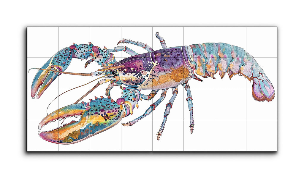 This tile mural features a highly stylized and colorful lobster, spread across two panels for a complete depiction. The horizontally oriented creature boasts a vibrant palette of blues, purples, oranges, and pinks, adorned with intricate patterns and fine details. Its oversized claws, slender legs, and elongated antennae contribute to its whimsical and fantastical appearance. The artwork blends realism with imaginative color and design, celebrating the lobster's natural form in a playful, artistic manner.