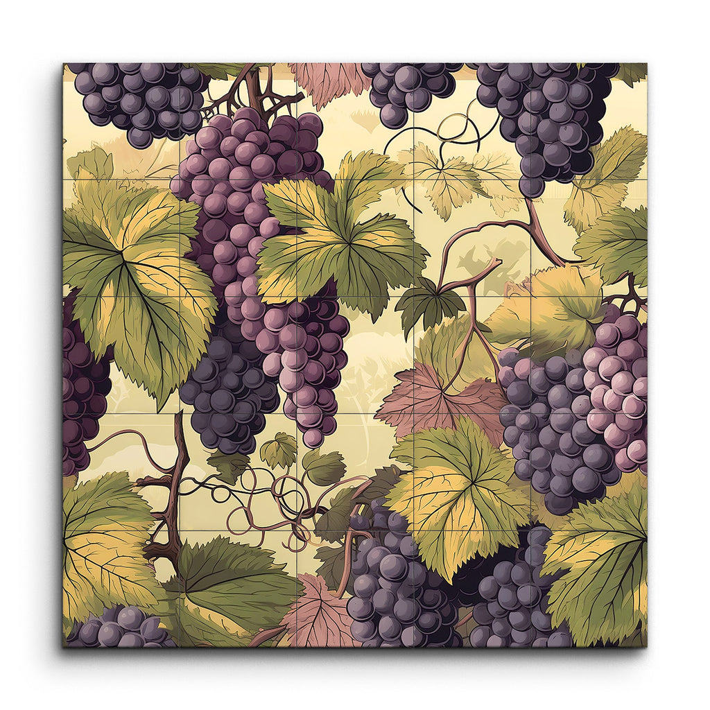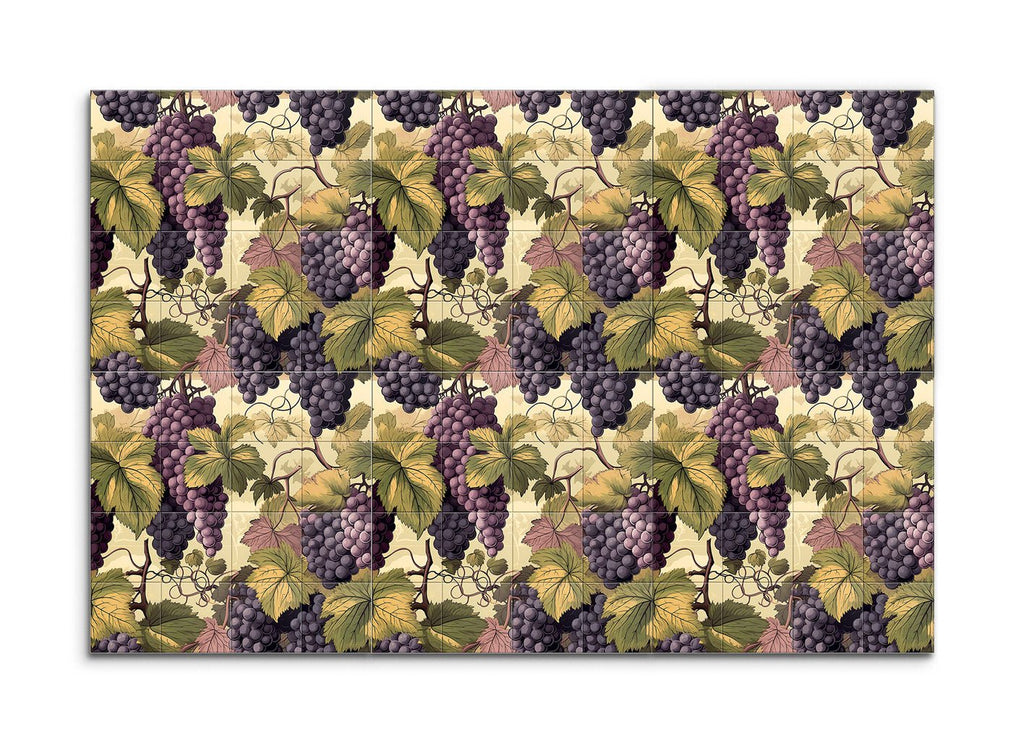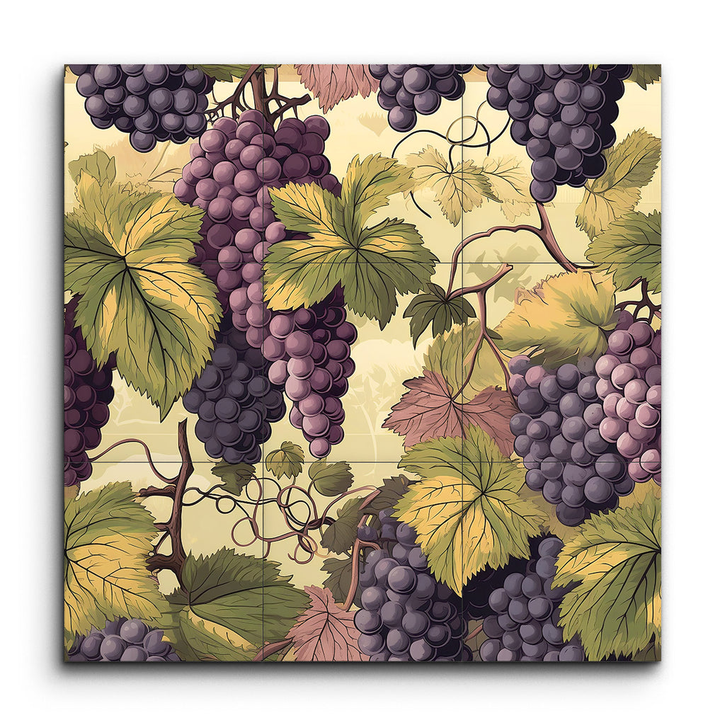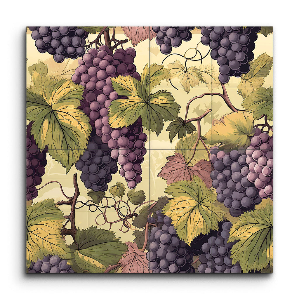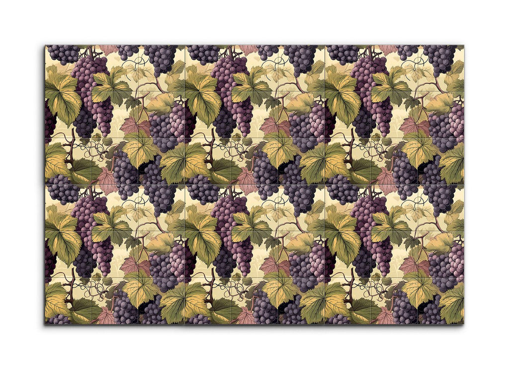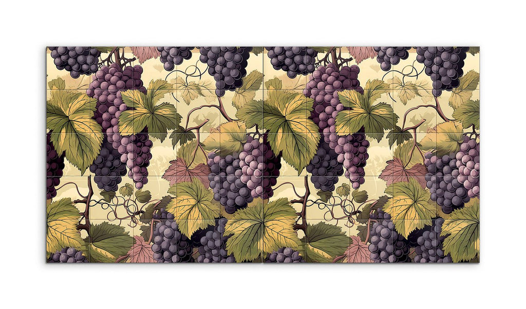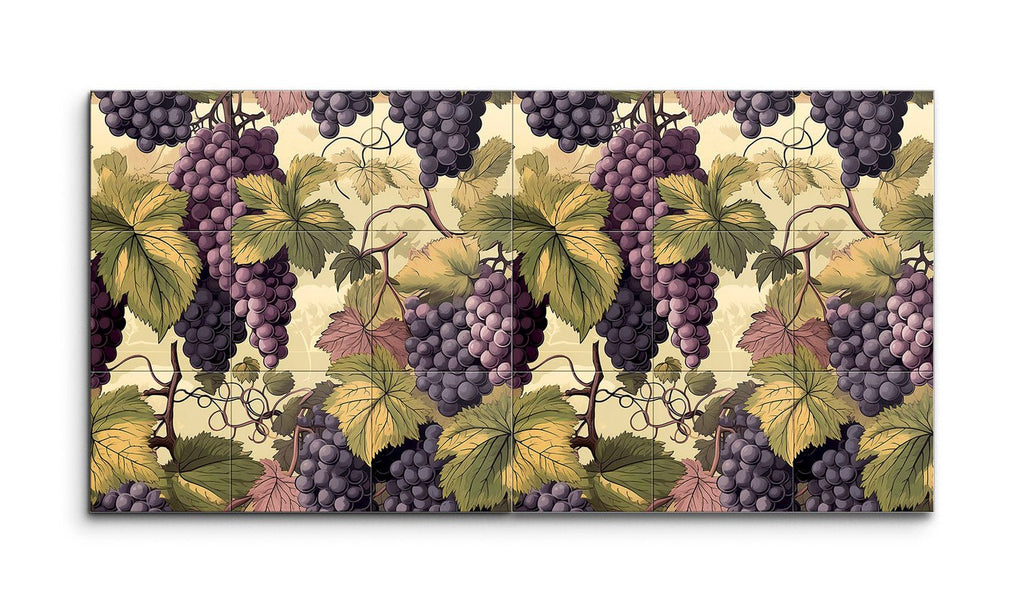 Transform your space with this exquisite tile mural, showcasing a lush vineyard scene. The artwork captures the beauty of grapevines heavy with clusters of grapes in varying shades of purple, from deep and rich to light and translucent. Meticulous detailing of the leaves transitions from lush green to autumnal yellows and browns, while intertwining tendrils add dynamic flow. Reminiscent of botanical illustrations, this mural offers a balanced composition, evoking a sense of abundance and natural elegance.
