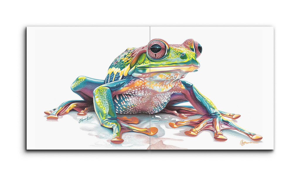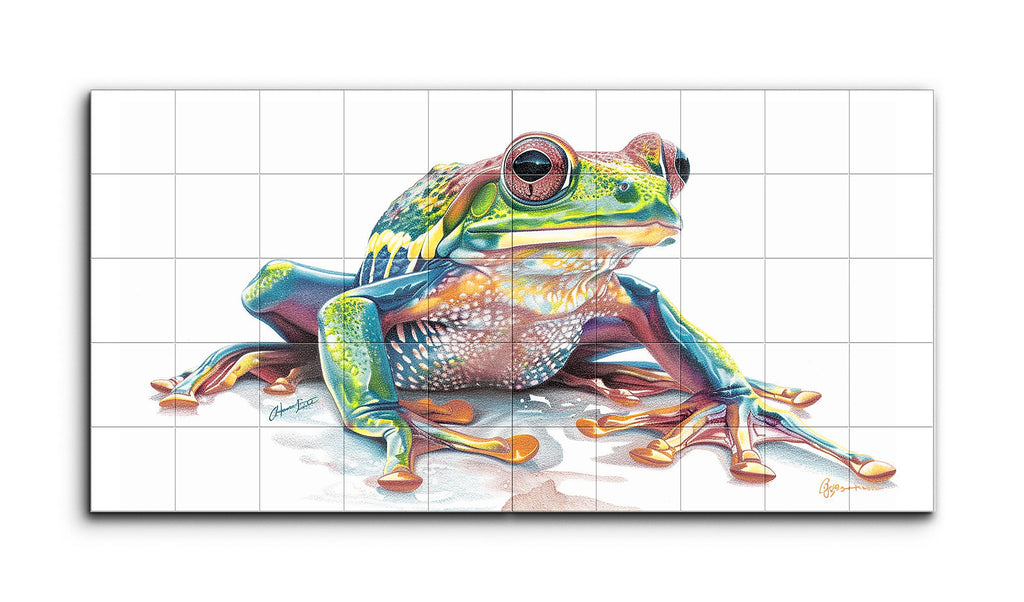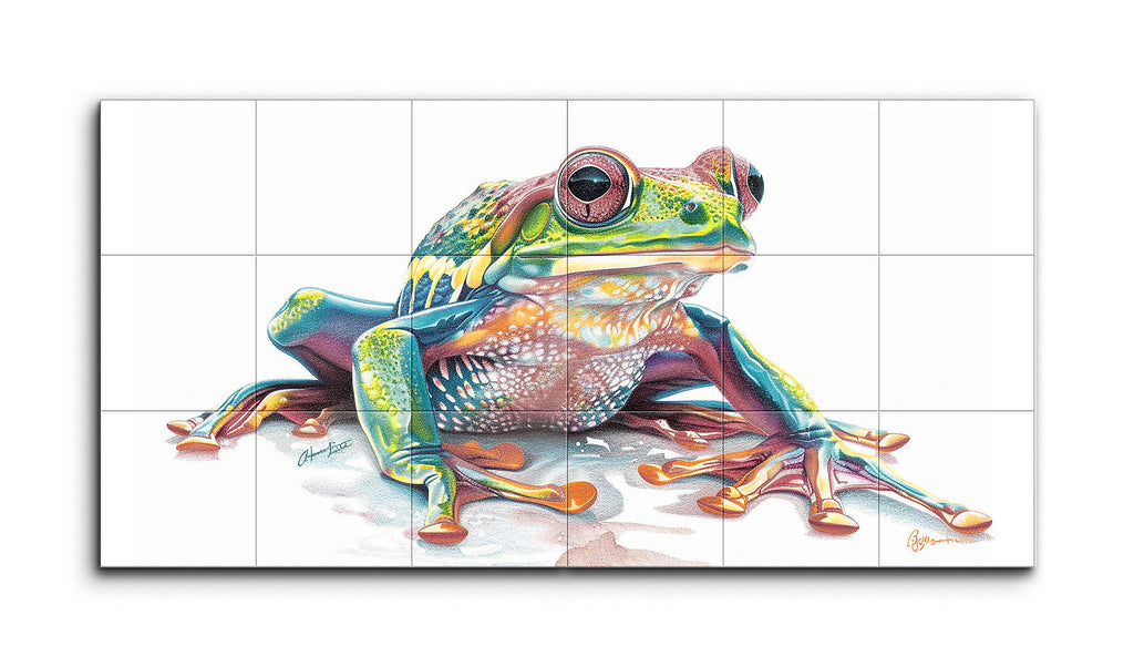 This tile mural showcases a strikingly detailed and colorful depiction of a frog, blending realism with hyperrealism. The frog's skin glistens with lifelike moisture, rendered in a vibrant mix of greens, blues, yellows, and purples. Expert use of light and shadow creates a three-dimensional effect, while the frog's reflective eye, with its intricate iris and pupil, draws the viewer in. The naturalistic pose adds a dynamic touch, making the artwork a vivid and captivating portrayal of the amphibian.