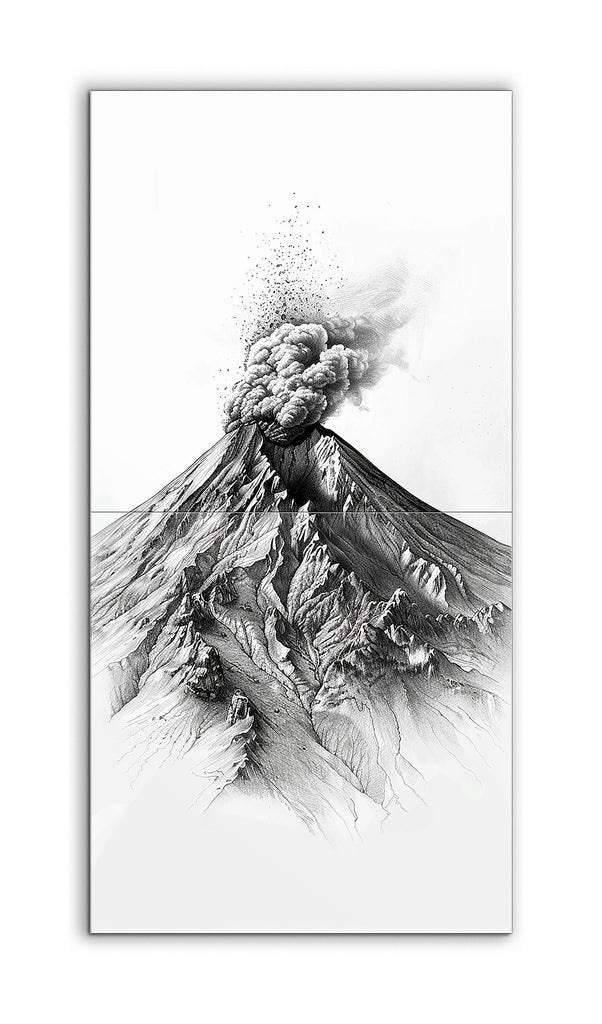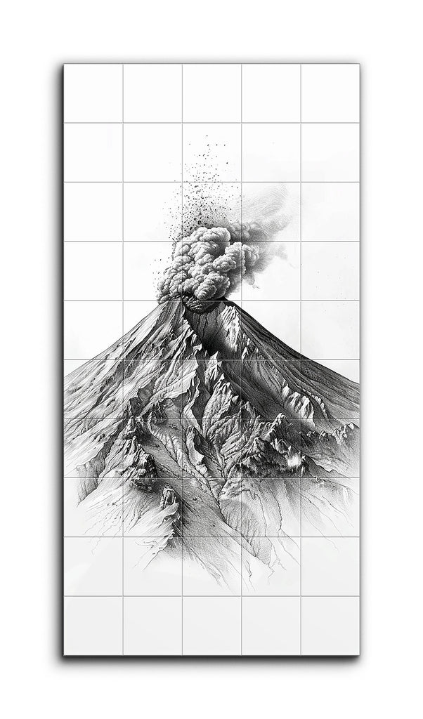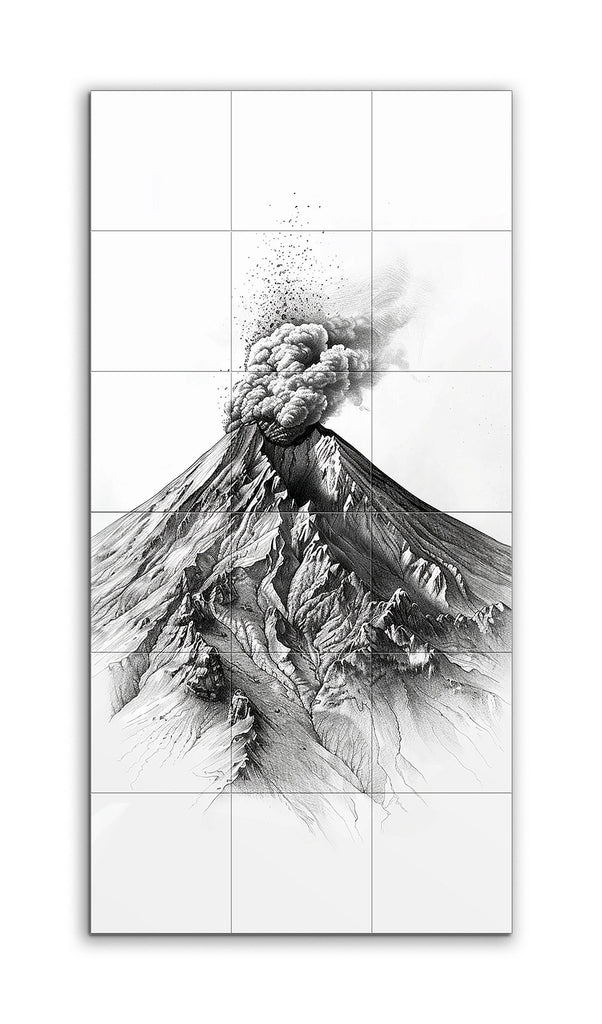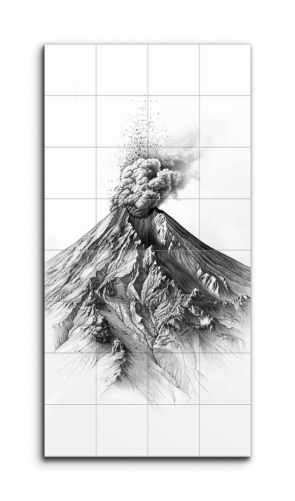 This tile mural features a highly detailed black and white illustration of a volcanic eruption. The volcano is meticulously rendered, showcasing the rugged, jagged texture of its surface. Captured mid-eruption, a plume of smoke and ash billows from the crater, depicted with soft, wispy strokes to convey movement. Small particles and debris add to the chaotic scene. Skillful shading with a range of tones enhances the three-dimensional realism, while the monochromatic color scheme intensifies the dramatic atmosphere.