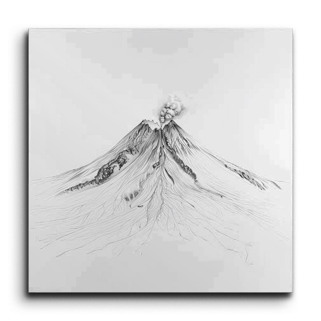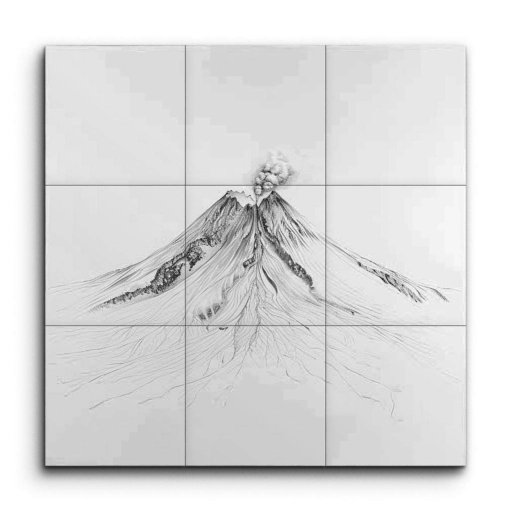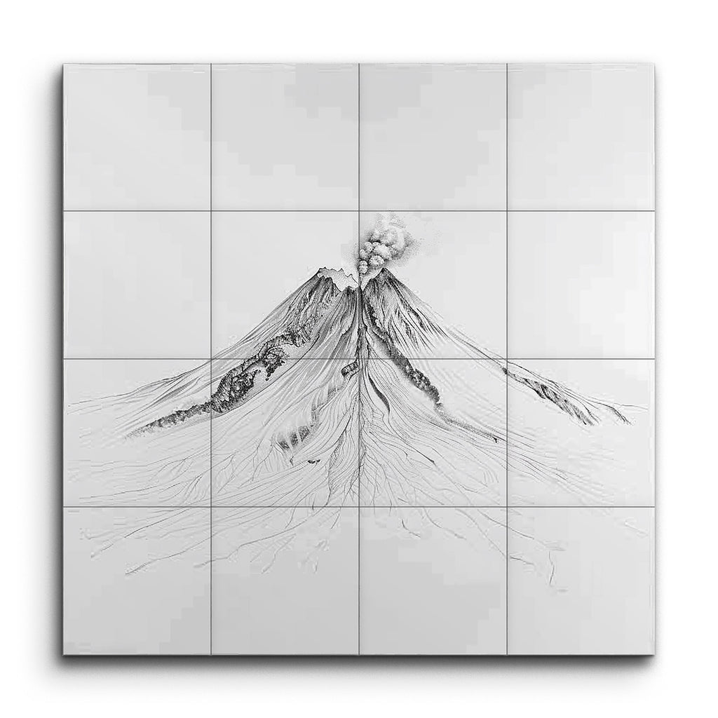 This stunning tile mural captures the raw power and majesty of a volcanic eruption in minimalist, monochromatic detail. The finely rendered illustration showcases a prominent peak with billowing smoke and ash, creating a dramatic contrast with the intricate, rugged slopes. Darker lines subtly indicate flowing lava, while the soft, cloud-like smoke adds depth and texture. Centrally placed, this artwork draws the viewer into the awe-inspiring force of nature, making it a striking centerpiece for any space.