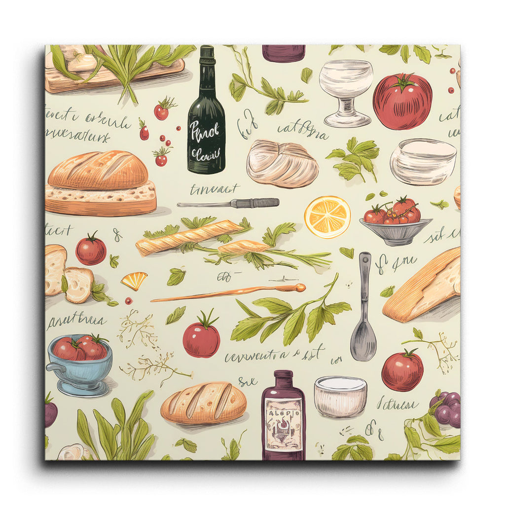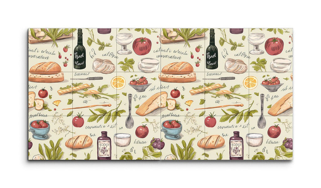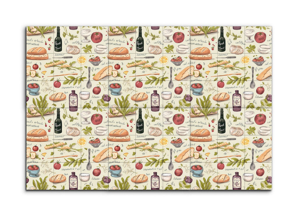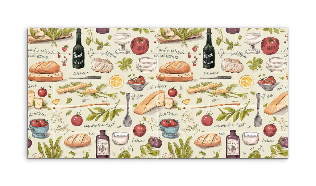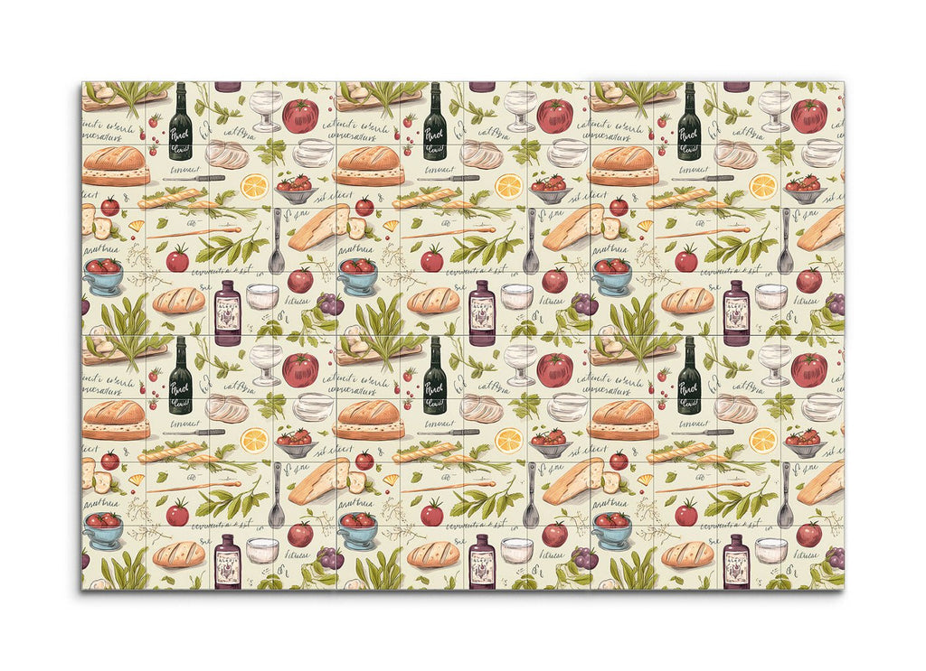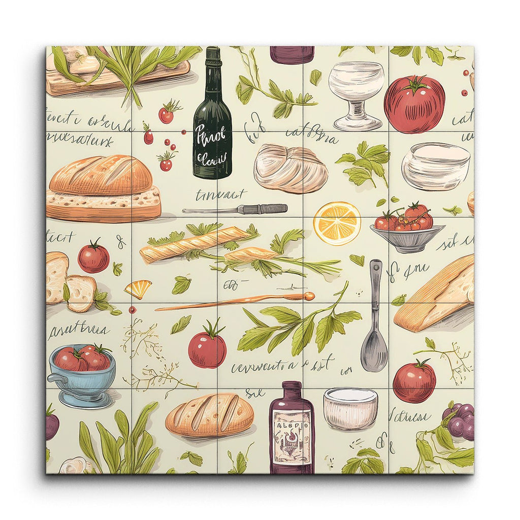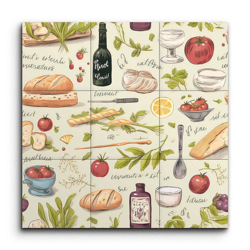 Indulge in the art of culinary delight with our charming tile mural, featuring a whimsical, hand-drawn illustration of food and drink items. Bread, baked goods, fresh vegetables, herbs, and a bottle of wine are scattered in a beautifully detailed and aesthetically pleasing arrangement. The muted, vintage colors and cursive labels evoke a cozy, inviting feel, celebrating the joy of preparing and savoring good food. Perfect for adding a touch of artisanal warmth to any kitchen space.