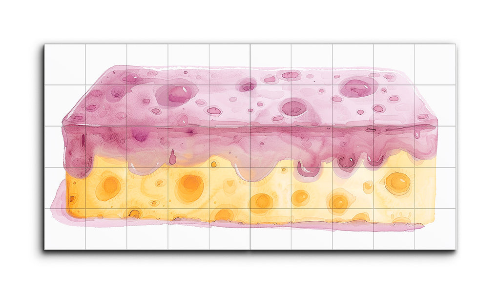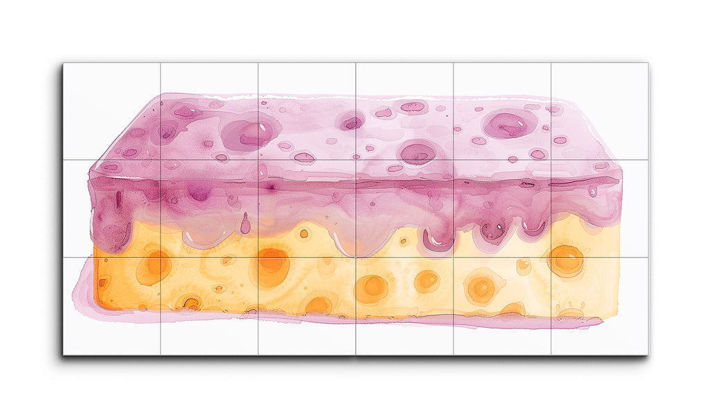 The artwork captures a stylized, whimsical depiction of a dessert-like, two-layered object, reminiscent of a slice of cake. The top layer features a translucent purple hue with shades and tints, evoking a jelly or glaze texture with imperfections and bubbles. The bottom layer, in a yellow-orange color, resembles a sponge or Swiss cheese with its circular voids. Soft pastel colors and a watercolor effect blend gently, creating a playful, nostalgic feel. Presented as a diptych, it combines simplicity and sophistication in a modern format.