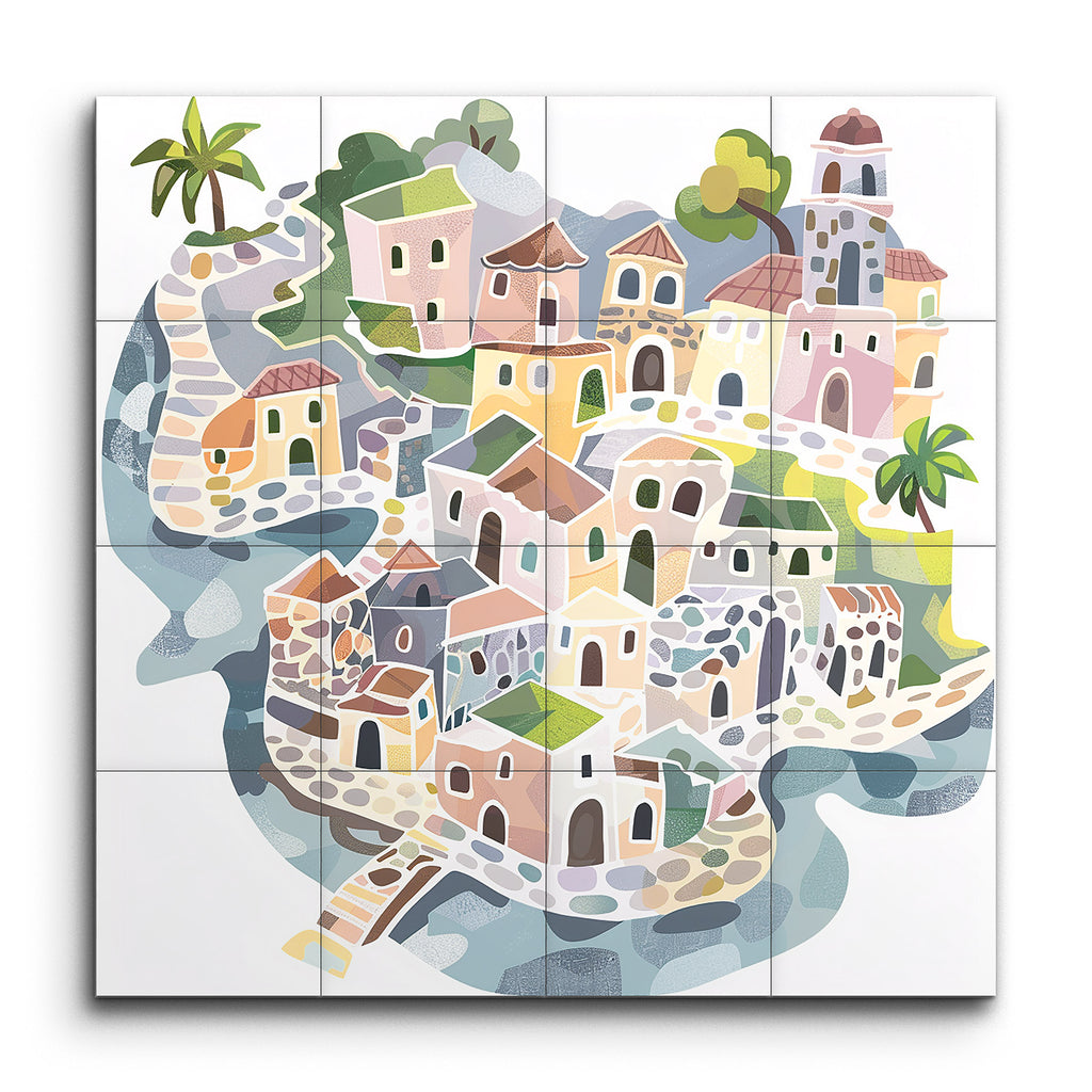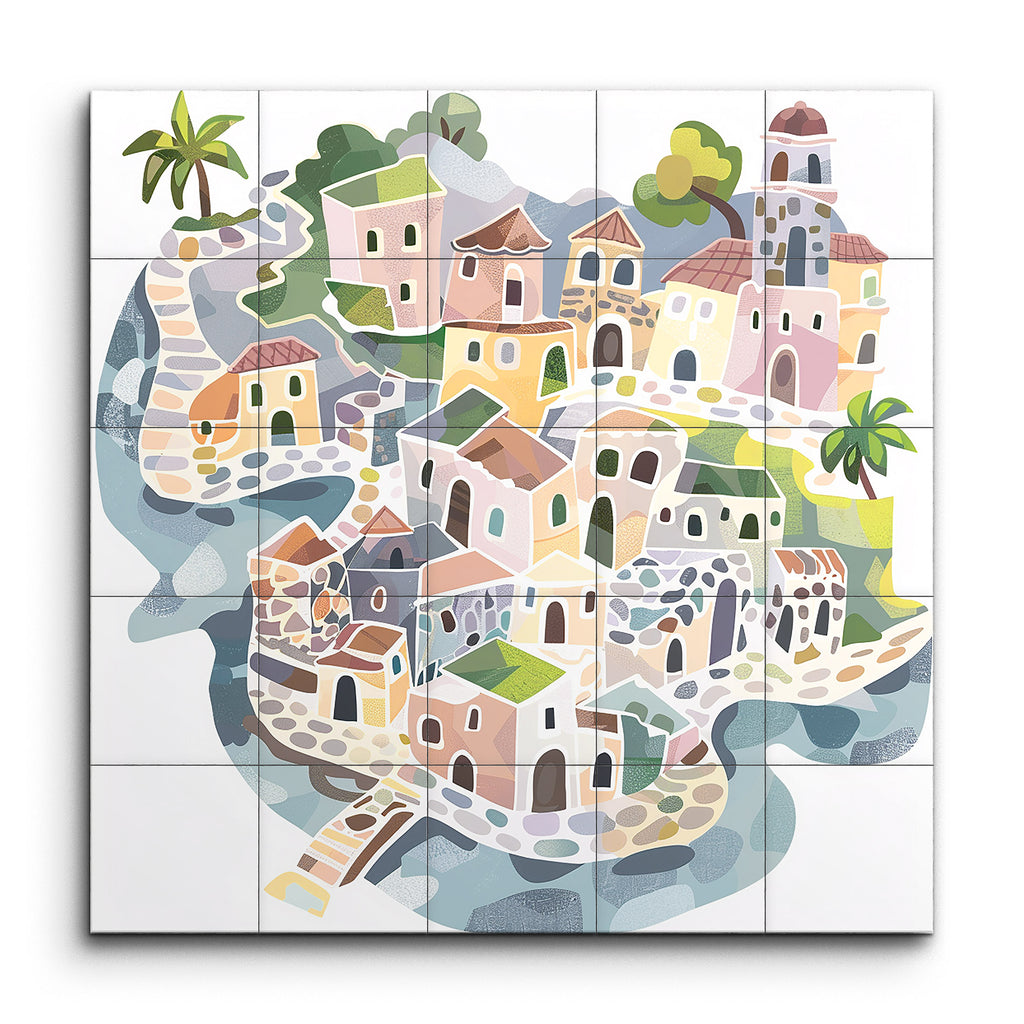 Step into a whimsical world with our captivating tile mural, showcasing a charming, stylized village scene. This enchanting artwork features a medley of colorful Mediterranean-inspired buildings, each uniquely designed with soft pastel hues of pink, yellow, green, and blue. Winding cobblestone pathways weave through the village, creating a sense of movement and discovery. Stylized trees and plants, including palm trees, add to the Mediterranean ambiance, while the playful, geometric style brings a harmonious, illustrative charm to any space.