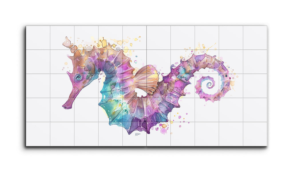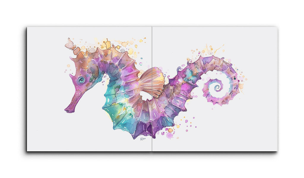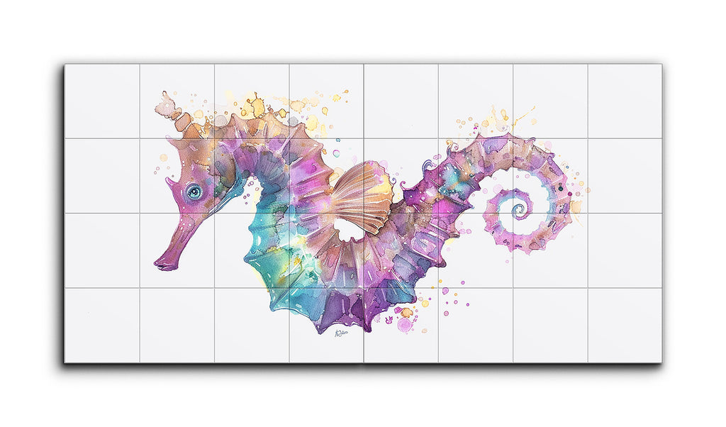 This tile mural features a stylized seahorse split across two canvas panels forming a diptych. The seahorse is depicted in a whimsical, ethereal manner with a vibrant blend of purples, blues, pinks, and yellows. The colors transition smoothly, creating a dreamlike quality. Realistic in form yet watercolor-inspired, the artwork includes splashes and speckles that extend beyond the seahorse's outline, suggesting movement. The elegant curl of the tail and the detailed eye add focal points, enhancing its dynamic and playful feel.