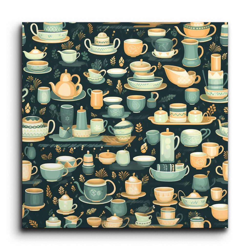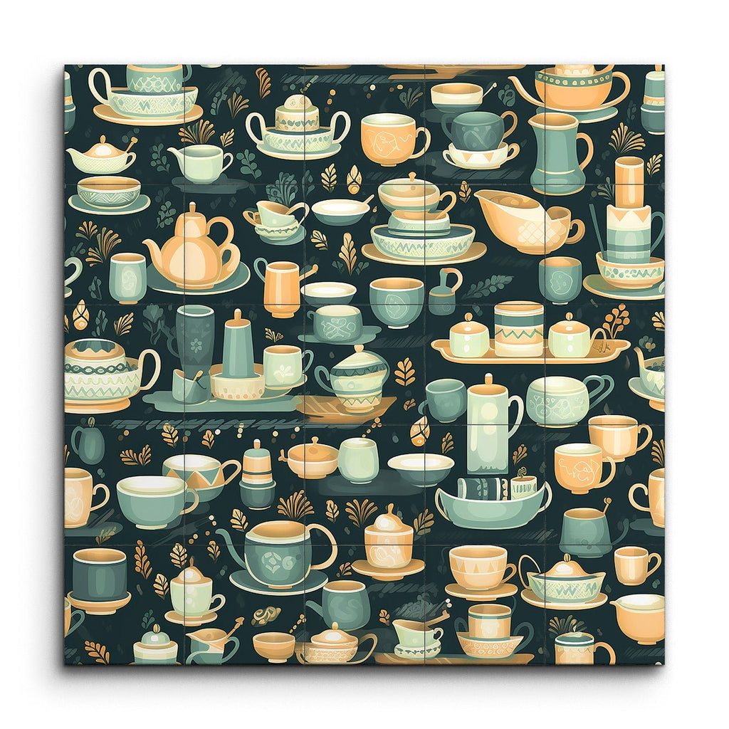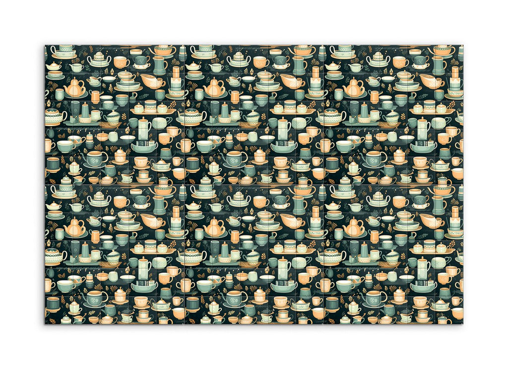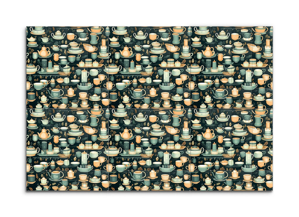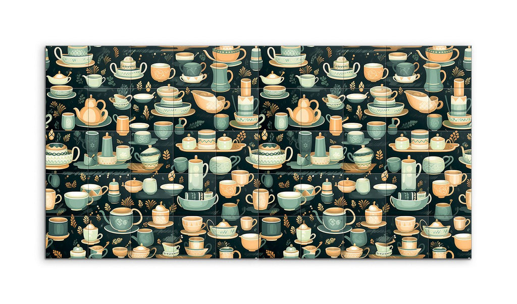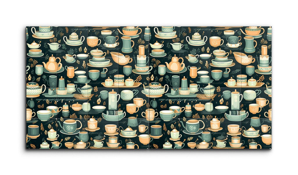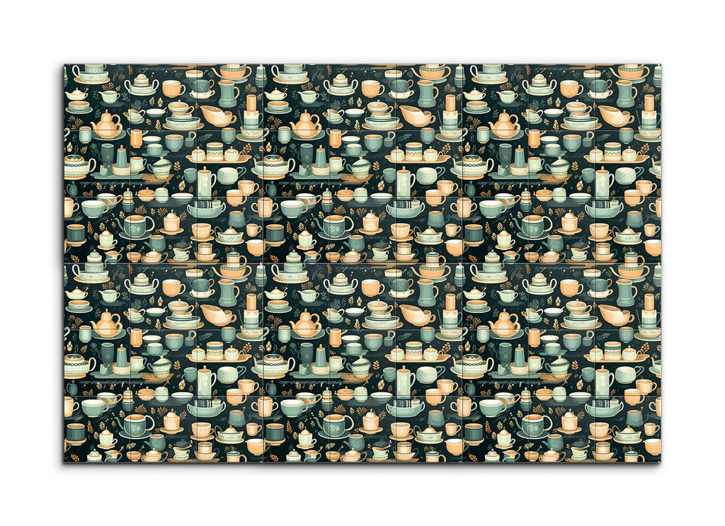 Transform your space with this enchanting tile mural, featuring a whimsical illustration of tea sets and kitchenware. The dark background beautifully contrasts with the pastel hues of teapots, cups, saucers, and more, creating a lively and dynamic composition. Each item is intricately detailed with floral motifs, stripes, and geometric shapes, evoking a nostalgic charm reminiscent of vintage kitchenware. This piece exudes warmth, elegance, and sophistication, making it the perfect addition to any home.