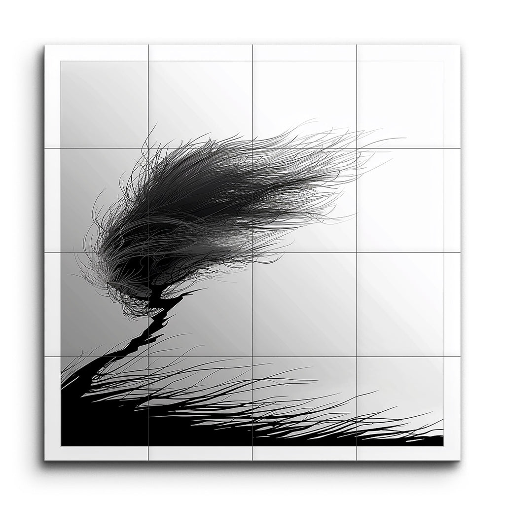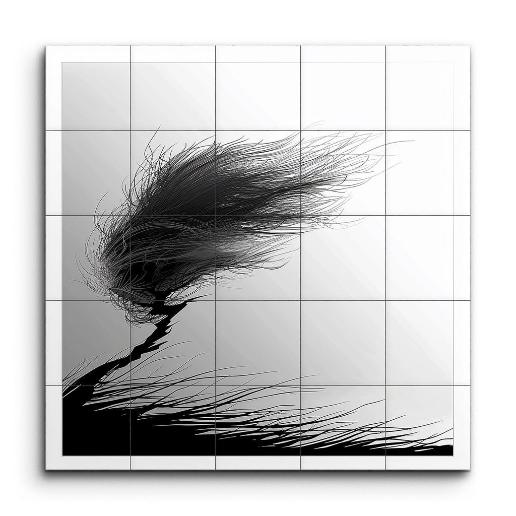 This stunning tile mural showcases a stylized black-and-white windswept tree, dramatically bent to the right under the force of a strong wind. The fine, wispy lines of the branches and leaves create a sense of fluid motion, while the thicker lines of the trunk and roots ground the tree firmly. The minimalistic composition, with its striking contrast and intricate details, evokes resilience and grace, blending traditional ink drawing with modern digital art for a powerful depiction of nature's beauty.