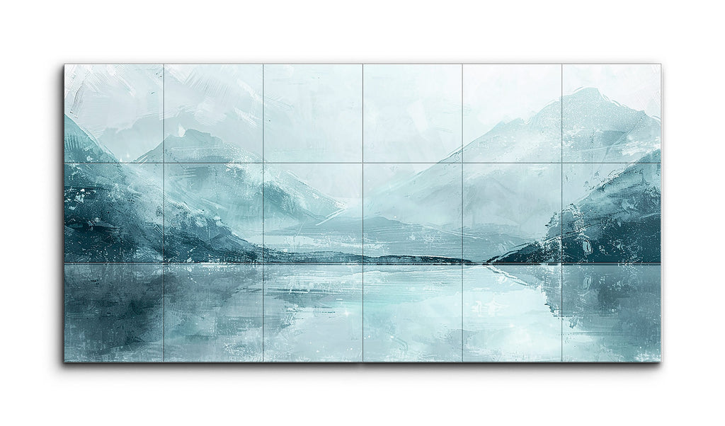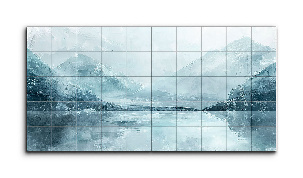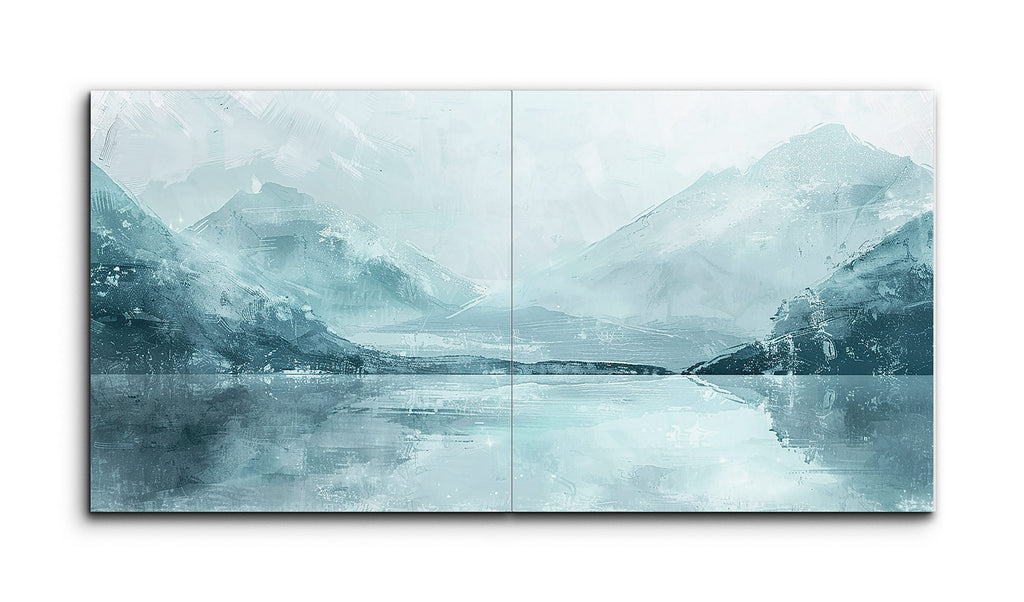 This diptych tile mural presents a serene, mountainous landscape with a tranquil body of water in the foreground. Rendered in a semi-abstract style, the artwork features a cool, monochromatic palette of blues and whites, evoking a wintry atmosphere. Loose, expressive brushwork captures the textures of the mountains and their reflections on the water, creating depth and a sense of misty distance. The composition's lower horizon line accentuates the expansive, gestural sky, enhancing the scene's peaceful and contemplative mood.