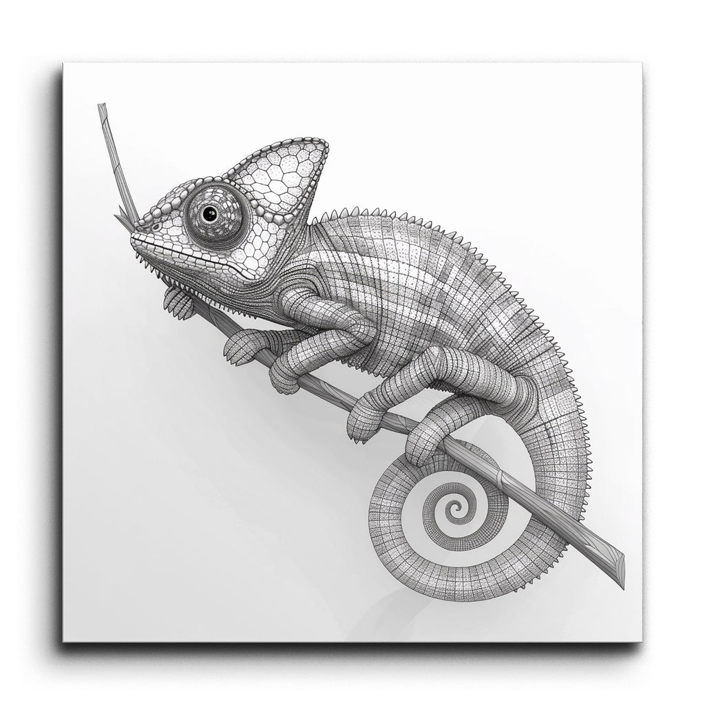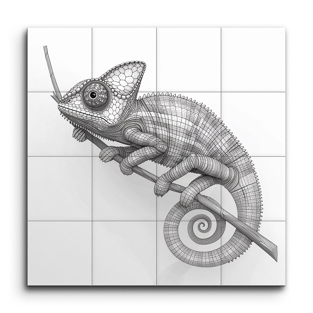 Transform your space with this captivating tile mural, showcasing an intricate wireframe drawing of a chameleon perched on a branch. The detailed side profile captures the chameleon's textured, honeycomb-patterned eye and interlocking lines that mimic its scales. With a coiled tail and meticulously drawn limbs grasping the branch, this artwork merges technical precision with artistic flair. The wireframe style lends a three-dimensional, almost digital quality to the piece, making it a visually striking addition to any room.