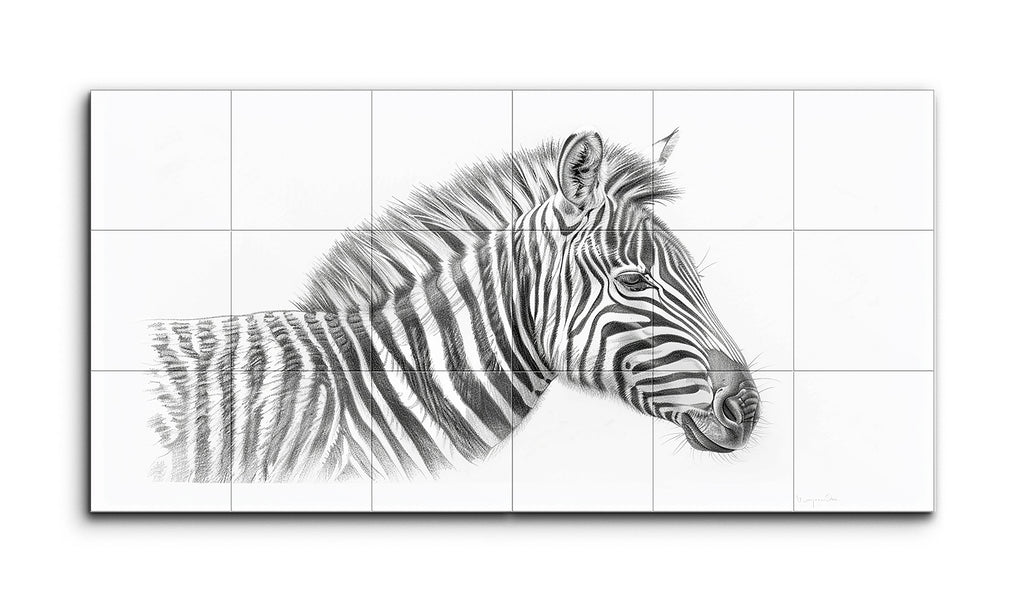 This tile mural features a meticulously detailed black-and-white drawing of a zebra's head and upper neck, depicted in profile. The artist has expertly captured the zebra's distinctive stripes, varying in thickness and curvature, to create a realistic and textured appearance. The upright mane is illustrated with fine lines, and the alert ears are subtly shaded. The expressive eye, finely detailed nostrils, and mouth add lifelike qualities, showcasing the zebra's natural beauty and unique characteristics.