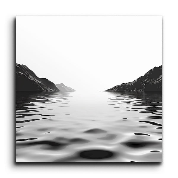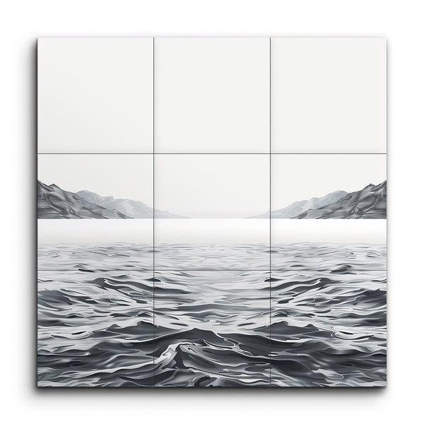 Immerse yourself in tranquility with our minimalist tile mural, showcasing a serene landscape of calm waters flanked by majestic mountains. Rendered in monochromatic shades of black, white, and gray, the artwork captures light and shadow...