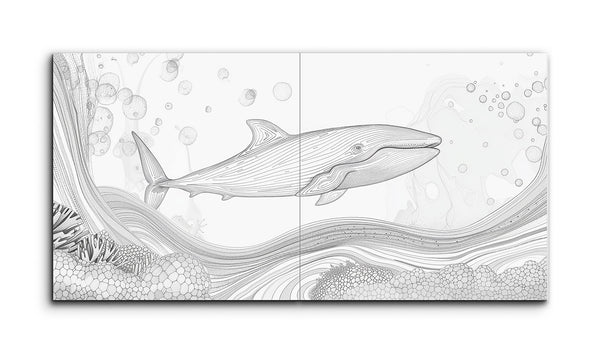 This two-panel tile mural showcases a detailed line drawing of a dolphin in side profile, swimming gracefully through water. The dolphin's streamlined body, from its beak-like snout to its flukes, is intricately rendered with subtle...