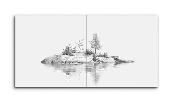 This two-panel diptych captures a tranquil scene featuring a small, rocky island adorned with sparse trees and shrubs. The island is mirrored in a calm body of water, enhancing the sense of serenity. Rendered in...