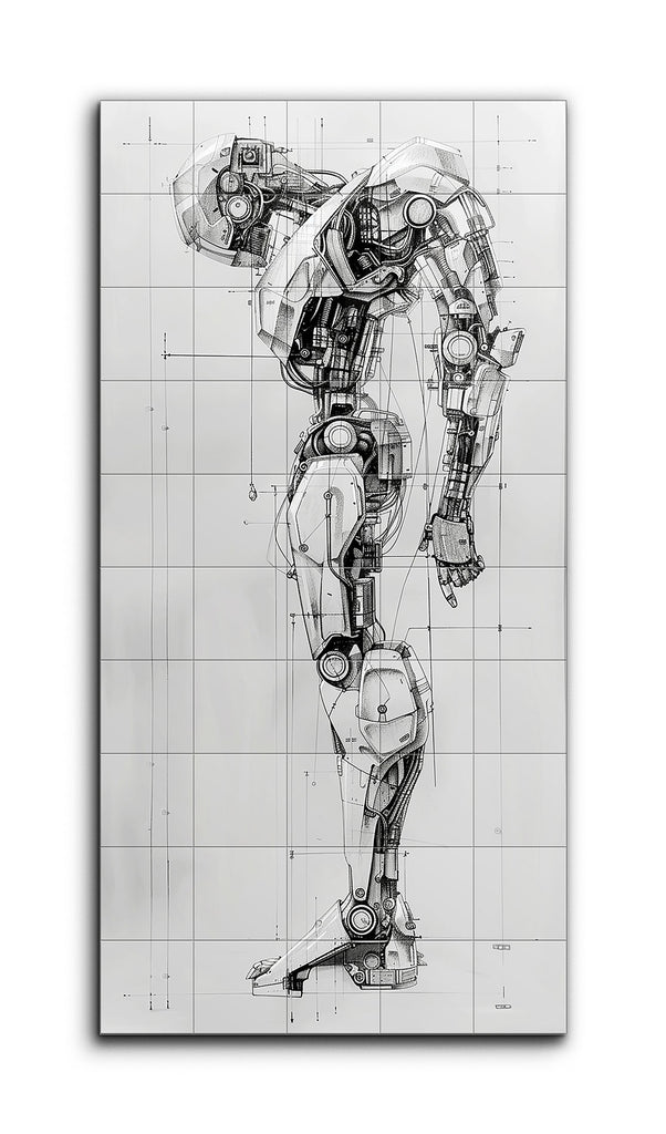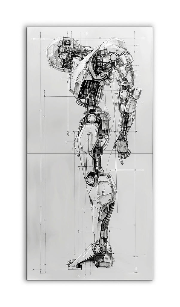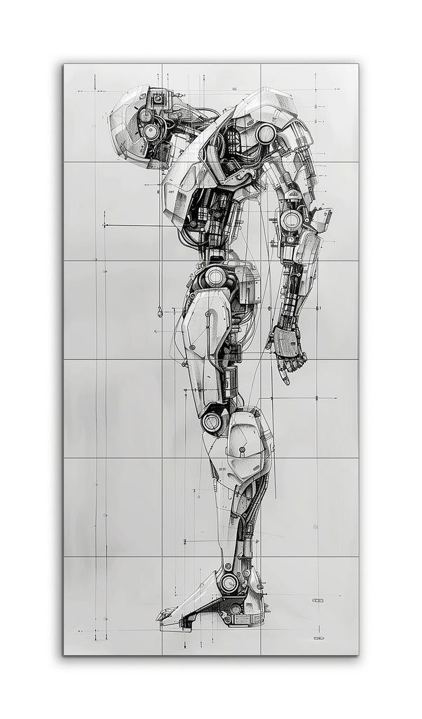 Questo murale in piastrelle presenta un'illustrazione dettagliata e tecnica di un robot umanoide di profilo, leggermente piegato in vita con la testa inclinata verso il basso. Il design intricato mette in evidenza componenti meccanici e strutturali, rendendo meticolosamente ingranaggi, pistoni e giunti per un effetto realistico. Le linee precise e le annotazioni dettagliate conferiscono l'aspetto di un disegno tecnico o di un progetto. Uno schema di colori monocromatico esalta la sua estetica futuristica e industriale, fondendo la precisione ingegneristica con una profondità artistica.
