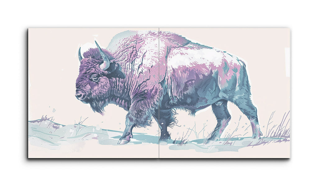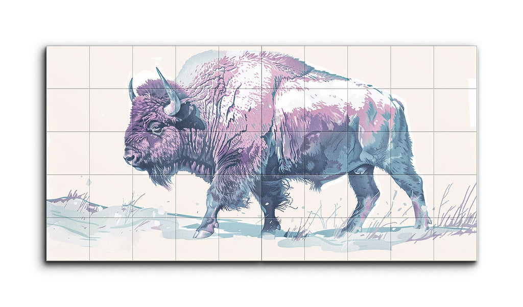 Questo murale in piastrelle presenta un bisonte stilizzato in profilo laterale, rivolto a sinistra. La palette di colori limitata di viola, rosa e azzurri chiari conferisce all'opera un'atmosfera eterea e non naturalistica. Contorni morbidi e dettagli testurizzati forniscono un senso di volume e massa, con linee che suggeriscono il pelo del bisonte. Lo sfondo minimalista e le linee di base simili a schizzi mantengono l'attenzione sul bisonte, risultando in un'opera d'arte moderna e grafica che fonde illustrazione e arte digitale per un effetto contemporaneo e sorprendente.