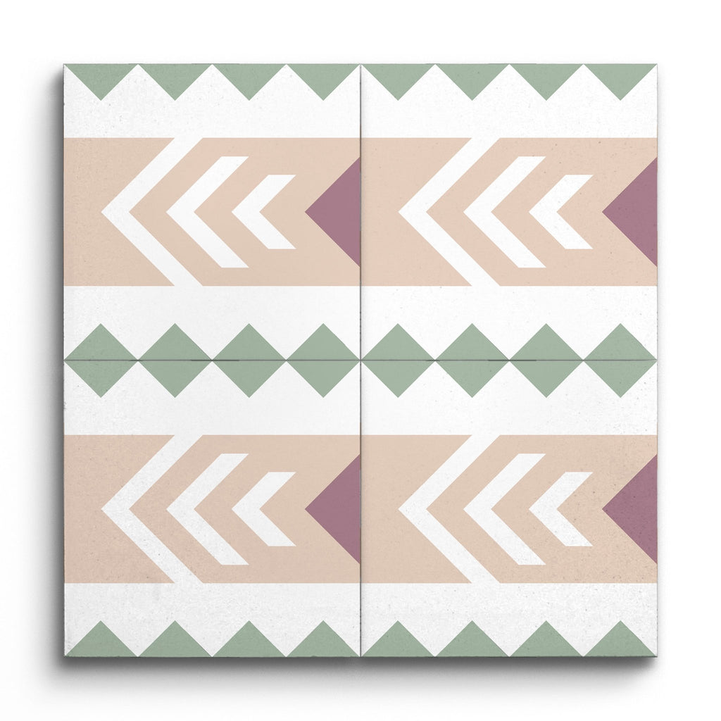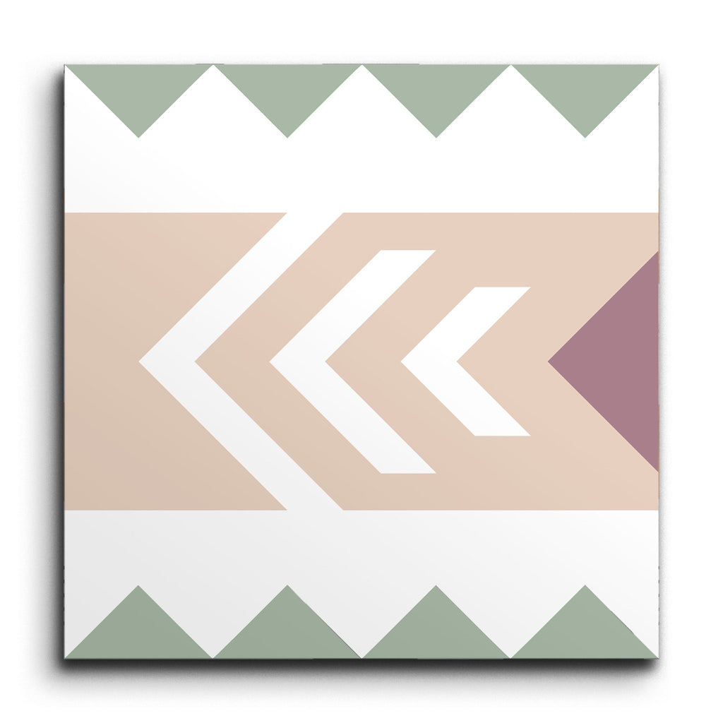 Questa piastrella decorativa presenta un affascinante design geometrico in cui forme audaci e angolari formano una serie di chevron che puntano verso l'interno. La palette di colori pastello, con verde tenue, pesca e malva, aggiunge un tocco rilassante al motivo dinamico. Le linee pulite e le forme ripetute riflettono un'estetica contemporanea che enfatizza semplicità e forma, rendendo questa piastrella un'aggiunta elegante a qualsiasi spazio moderno.