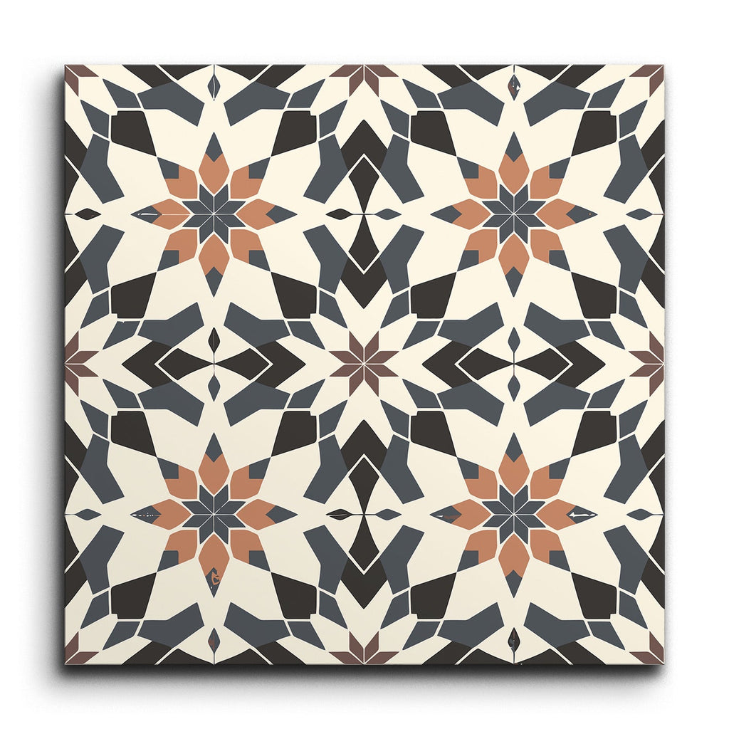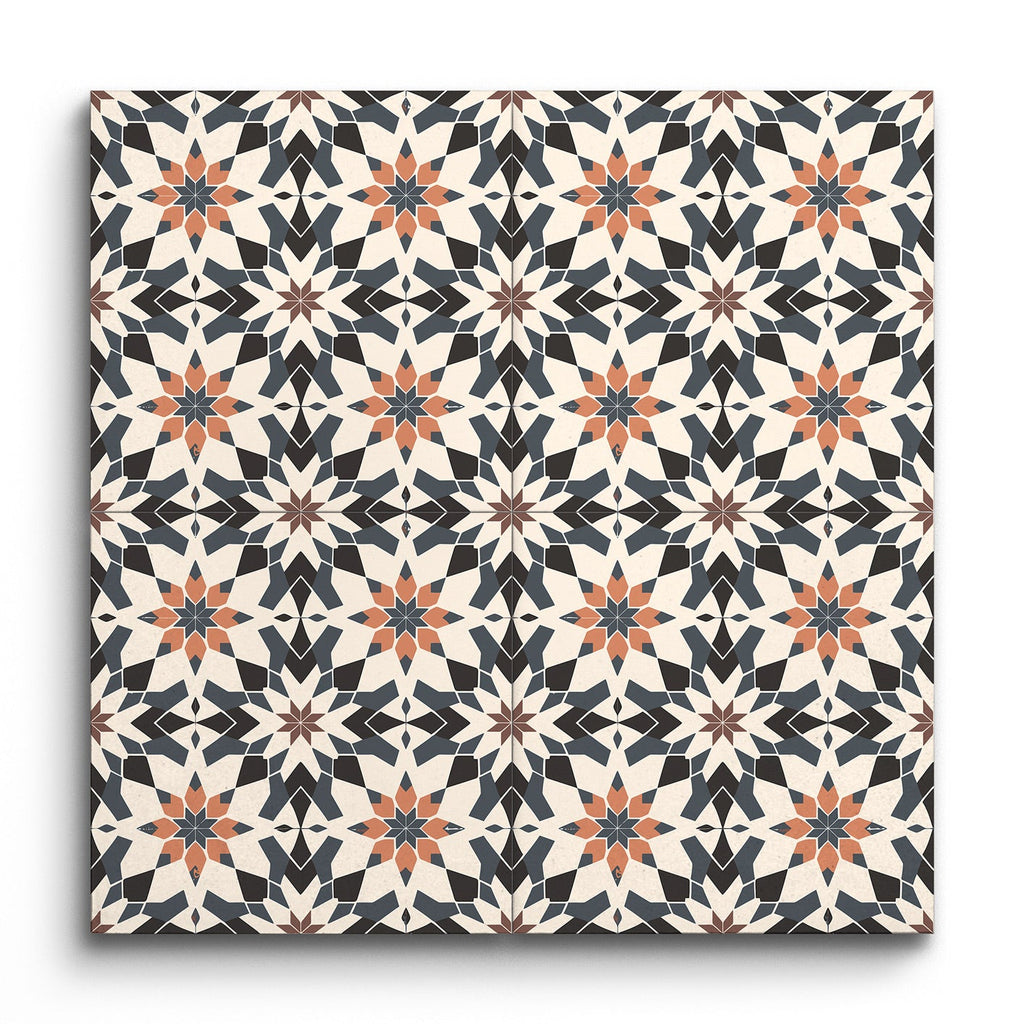 This decor tile showcases a classic encaustic design, featuring a striking star-like motif at its center. The intricate geometric pattern intertwines seamlessly, creating a sense of harmony and sophistication. Its color palette of muted black, white, dark blue, and terracotta offers a timeless appeal, making it a versatile choice for any space. The balanced contrast of these colors enhances the tile's visual interest, perfect for adding a touch of elegance and tradition to your interiors.