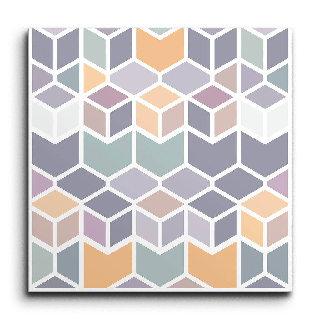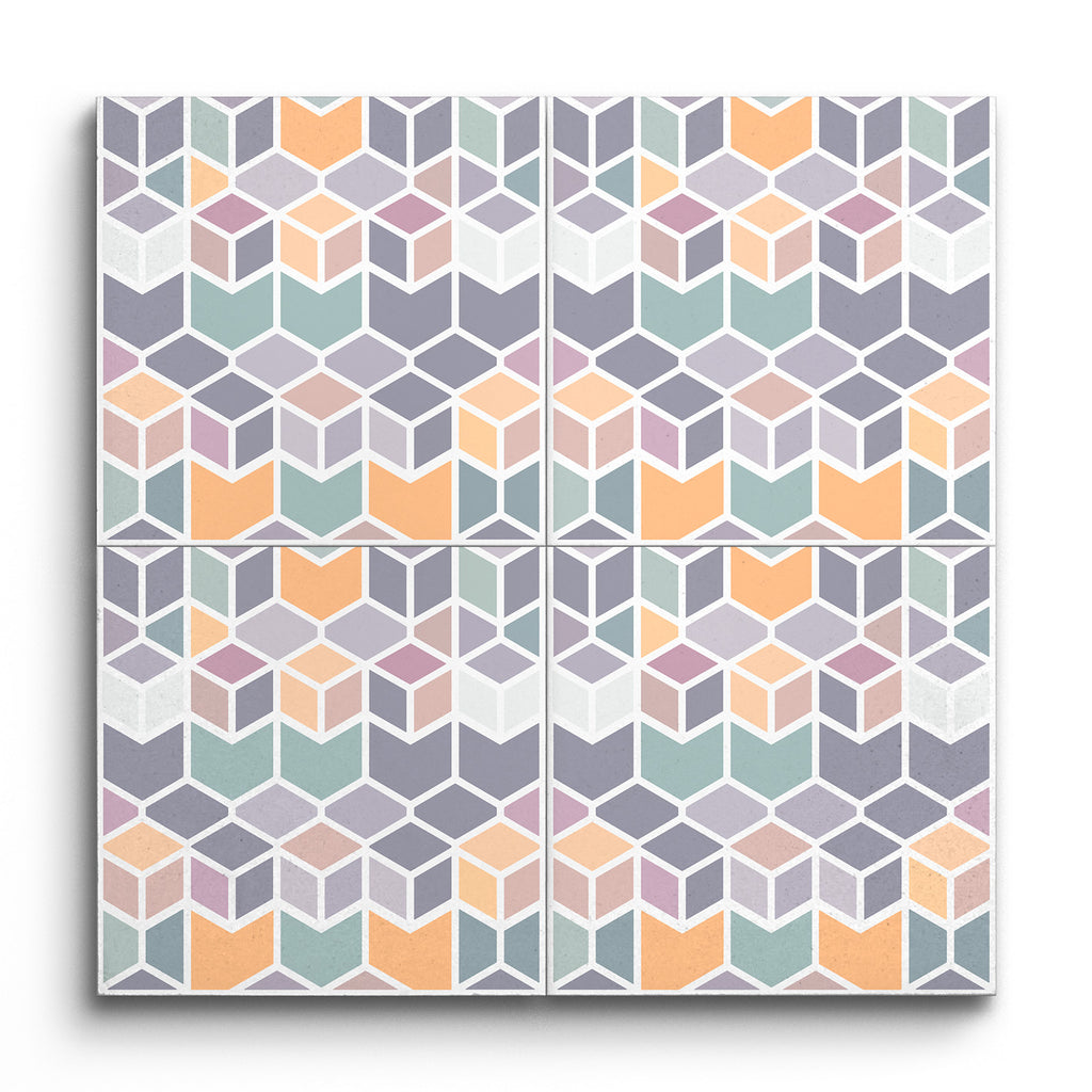 Questo Decorazione tassello presenta un affascinante motivo geometrico formato da esagoni interconnessi, creando un'impressionante illusione di cubo tridimensionale. Il design prende vita con una sottile palette di colori pastello, caratterizzata da morbide tonalità di pesca, lavanda, verde menta, grigio chiaro e bianco. Le linee pulite e la disposizione strutturata enfatizzano la simmetria e la ripetizione, offrendo un'estetica visivamente coinvolgente e moderna. Questo tassello introduce un elemento contemporaneo e stiloso, perfetto per infondere qualsiasi spazio con un tocco di sofisticazione moderna.