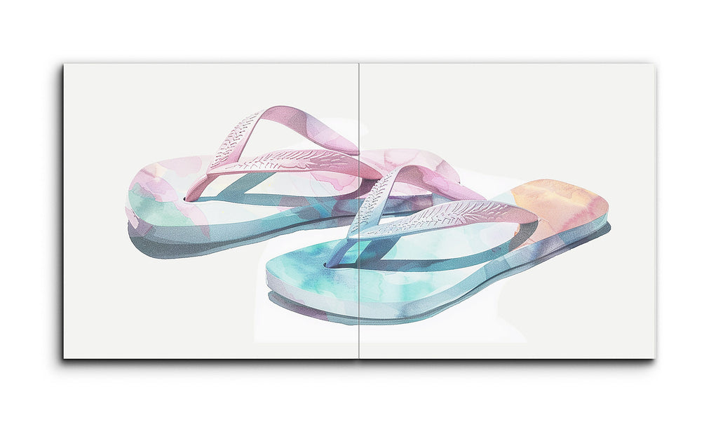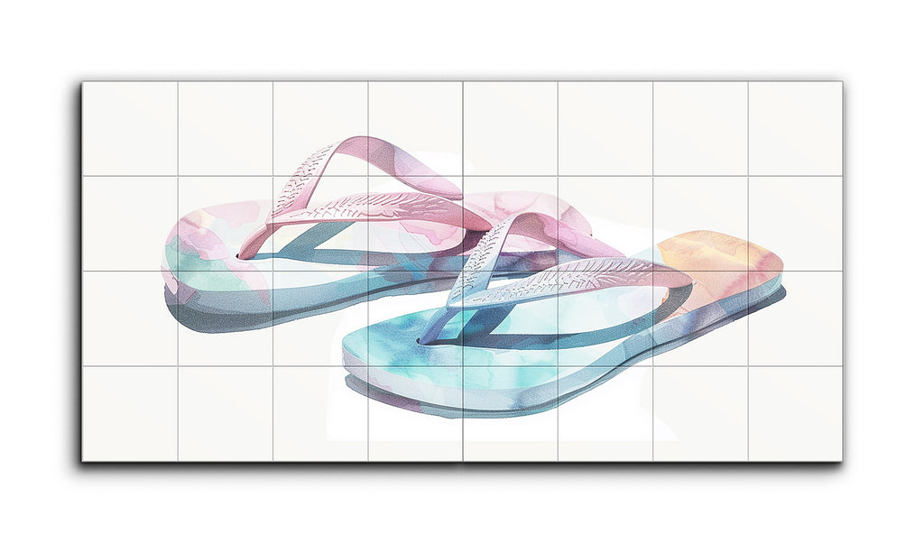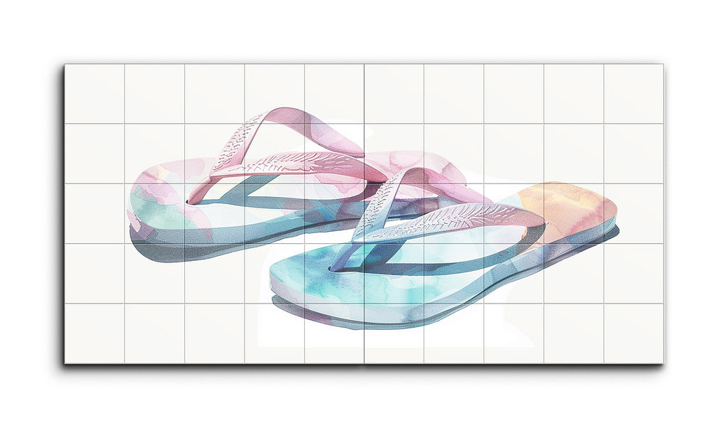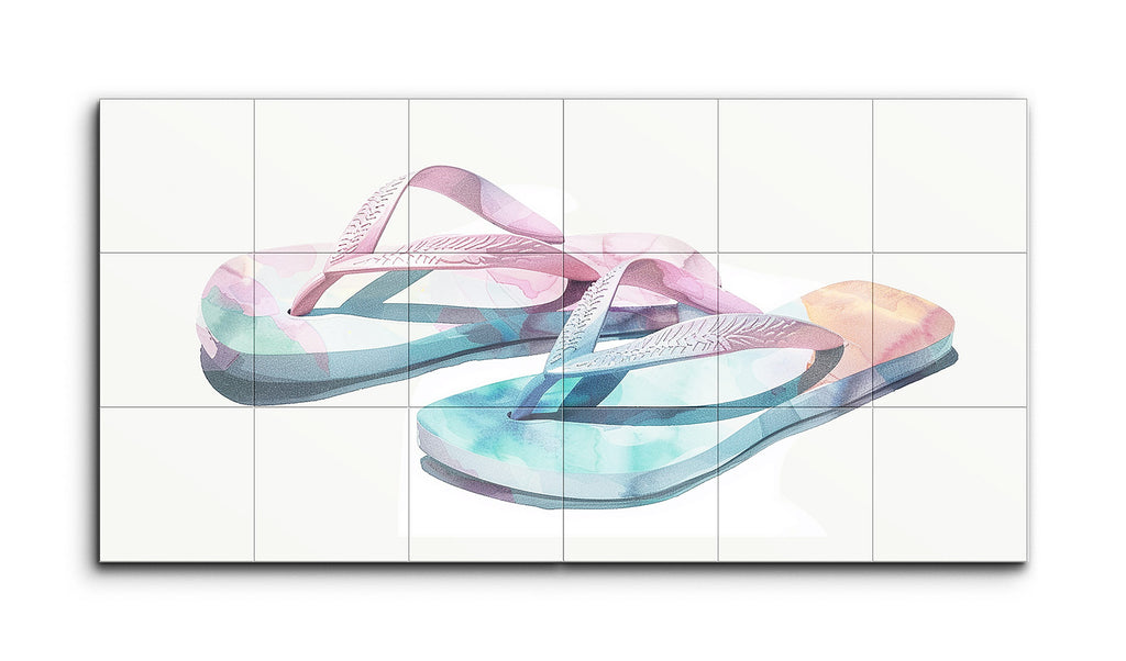 Questo murale in piastrelle presenta un paio di ciabatte realizzate in una morbida palette di colori pastello, che mescola tonalità di blu, rosa, viola e arancione in uno stile acquerello. Le cinghie mostrano un motivo sottile e intricato, aggiungendo texture e interesse visivo. L'opera d'arte leggera e ariosa emana una qualità delicata ed eterea, con le ciabatte traslucide che appaiono quasi senza peso. Ombre morbide e diffuse esaltano l'atmosfera serena e gentile, creando un'esperienza visiva tranquilla.