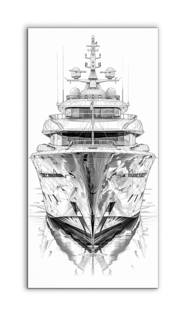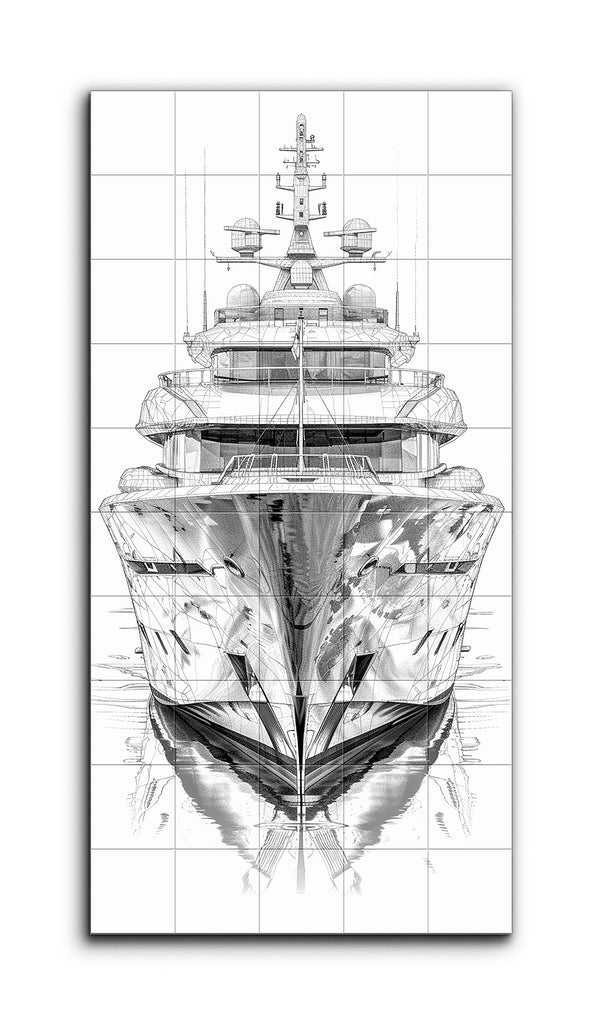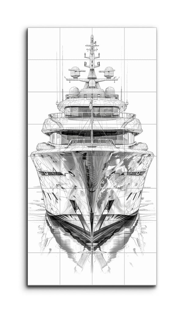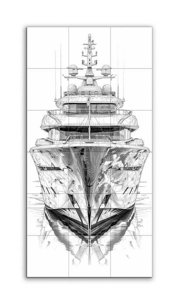 Questo murale in piastrelle presenta un disegno a linee altamente dettagliato, in bianco e nero, di un grande yacht visto frontalmente. L'opera d'arte mette in mostra lo yacht con una precisione intricata, evidenziando più ponti, ringhiere e antenne. Linee pulite e nette enfatizzano gli aspetti geometrici e simmetrici dell'imbarcazione, mentre il riflesso nell'acqua aggiunge profondità e realismo. Lo stile tecnico e architettonico ricorda i progetti, concentrandosi su accuratezza e dettaglio, creando un effetto di sofisticatezza e artigianato meticoloso.