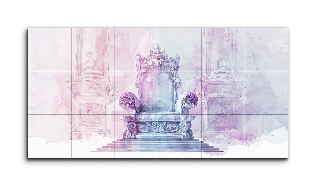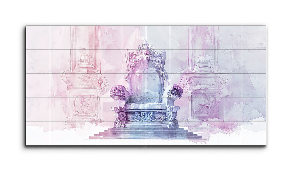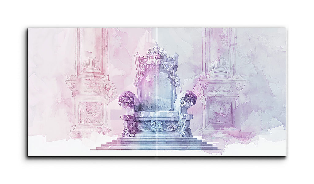 Quest'opera d'arte è una rappresentazione moderna e astratta di una sala del trono realizzata in morbidi pastelli—rosa, viola e azzurro—che evocano una qualità sognante ed eterea. Il trono ornato, posizionato centralmente, suggerisce un significato regale. Fiancheggiato da colonne simmetriche, l'atmosfera maestosa è accentuata da forme astratte e lavaggi di colore sullo sfondo, alludendo a un grande palazzo o tempio. La fusione di tecniche ad acquerello e design digitale crea un ambiente sereno, maestoso e tranquillo.
