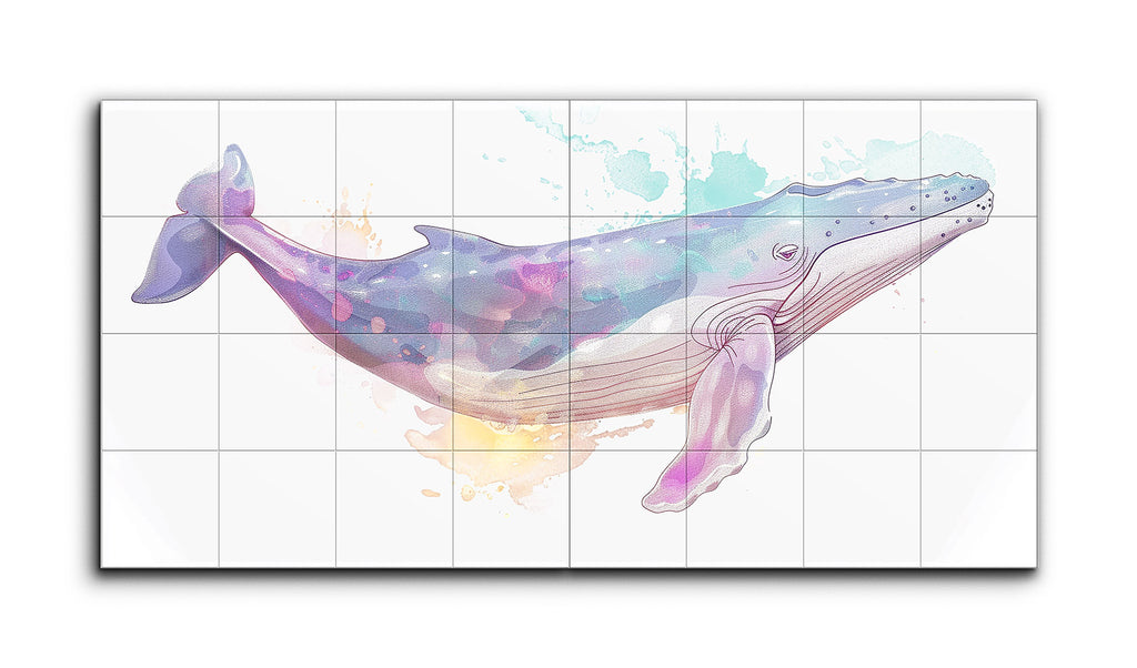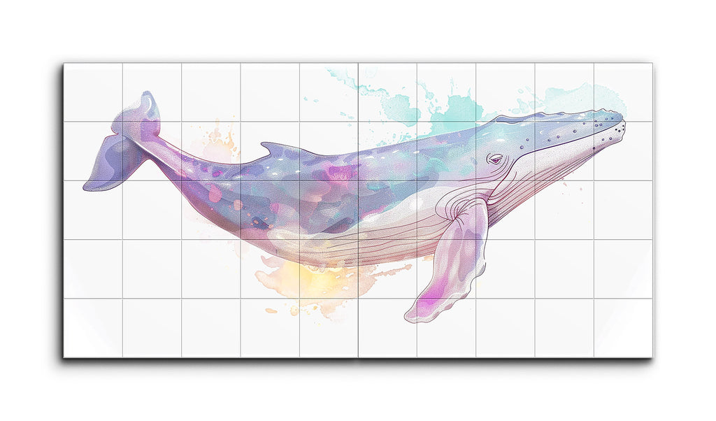 Questo murale in piastrelle presenta una balena fantasiosa, illustrata in morbide tonalità pastello di blu, viola e rosa, evocando un'atmosfera da sogno e serena. Il corpo della balena è adornato con motivi traslucidi simili a acquerelli, che aggiungono fluidità e movimento. Linee delicate e fluide delineano la balena, enfatizzando la sua natura aggraziata. Gli schizzi pastello sullo sfondo armonizzano con le tonalità della balena, creando una composizione coesa e incantevole che fonde realismo e fantasia.