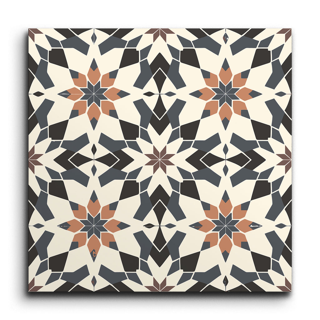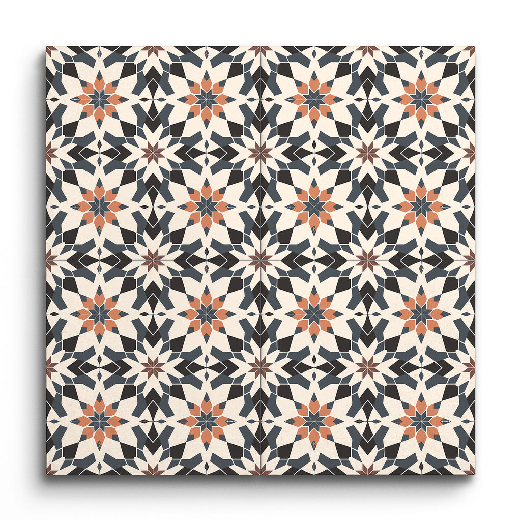 Questa piastrella Decorazione presenta un design encaustico classico, con un sorprendente motivo a forma di stella al centro. Il complesso schema geometrico si intreccia in modo armonioso, creando un senso di armonia e sofisticatezza. La sua palette di colori, composta da toni smorzati di nero, bianco, blu scuro e terracotta, offre un fascino senza tempo, rendendola una scelta versatile per qualsiasi ambiente. Il contrasto equilibrato di questi colori aumenta l'interesse visivo della piastrella, perfetta per aggiungere un tocco di eleganza e tradizione ai tuoi interni.