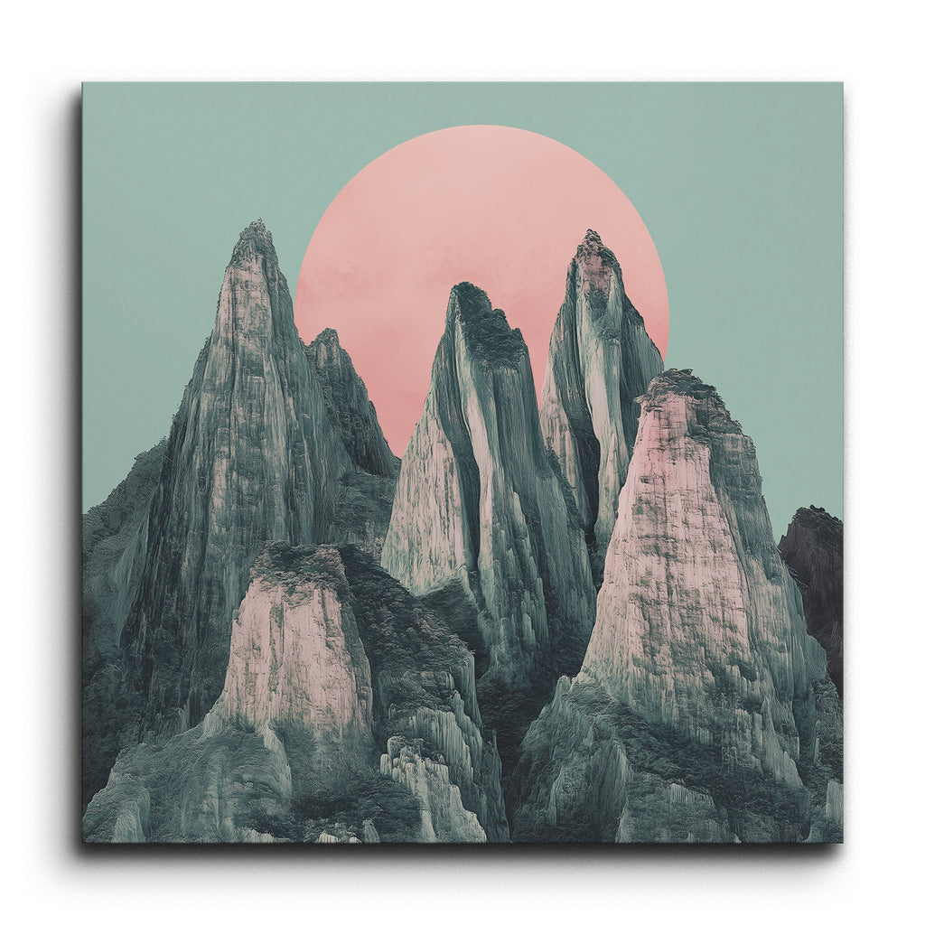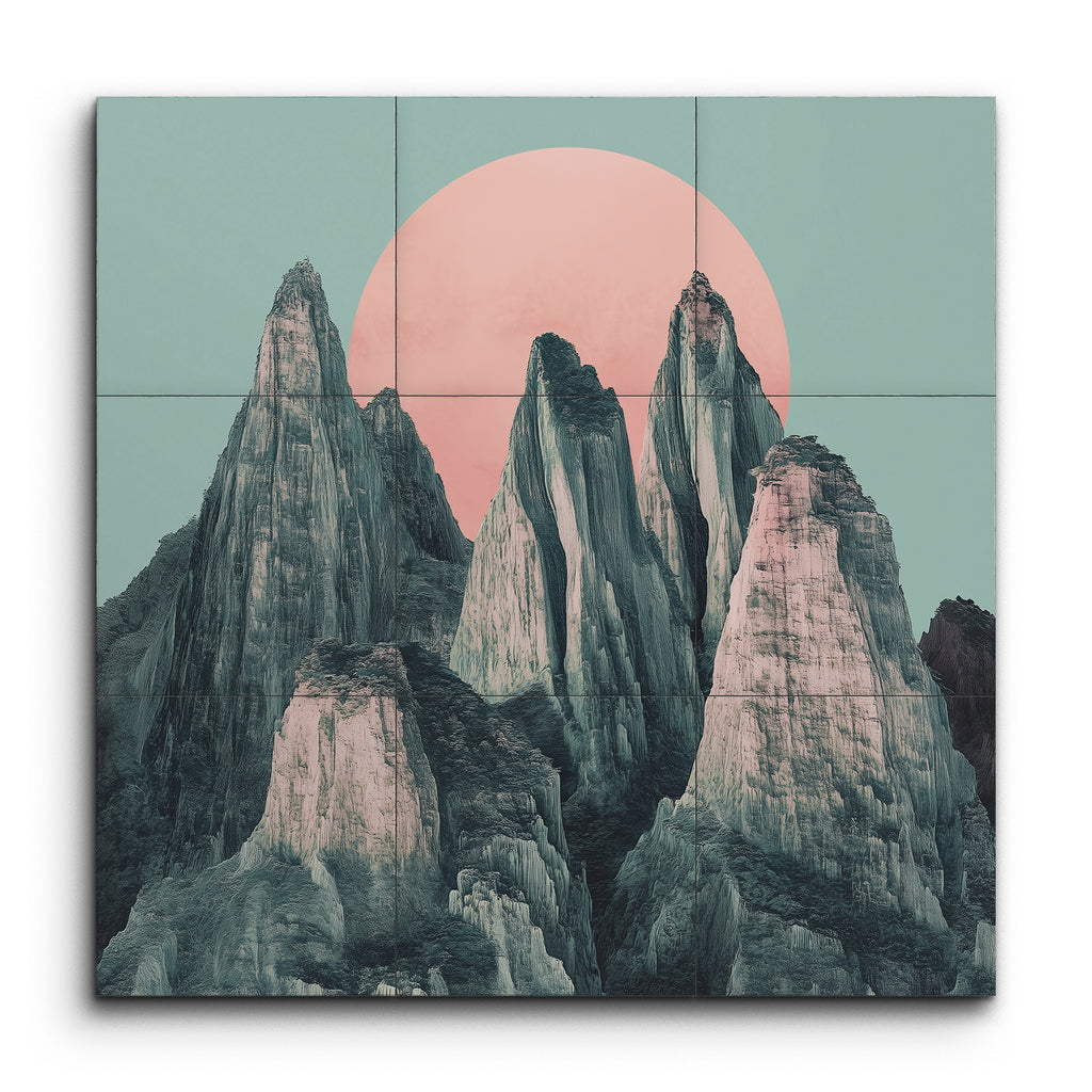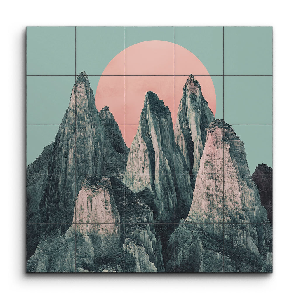 Questo murale in piastrelle mostra un paesaggio mozzafiato di montagne frastagliate e imponenti, impostato contro un grande sole rosa pallido. Le montagne sono rappresentate con dettagli intricati, evidenziando le loro texture ruvide e le punte affilate. La palette di colori tenui presenta tonalità di grigio e verde, creando un contrasto sereno con il sole rosa pastello. Il sole posizionato centralmente aggiunge profondità e tranquillità, mentre lo stile realistico e i colori minimalisti evocano un senso di calma e maestosità, catturando la grandezza della natura in una composizione armoniosa.