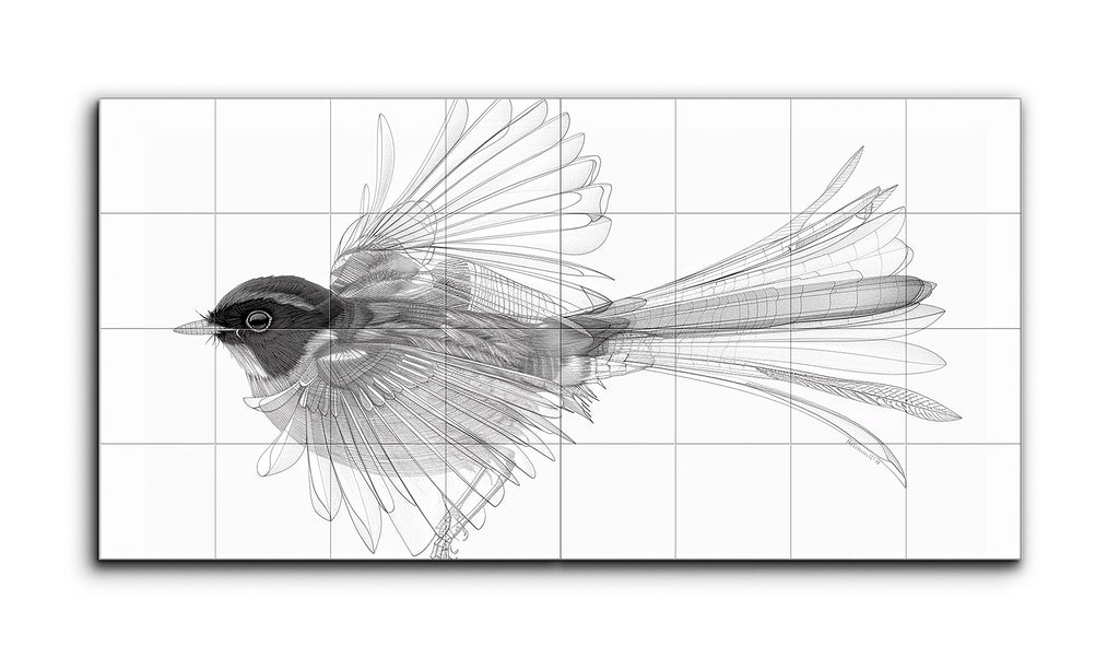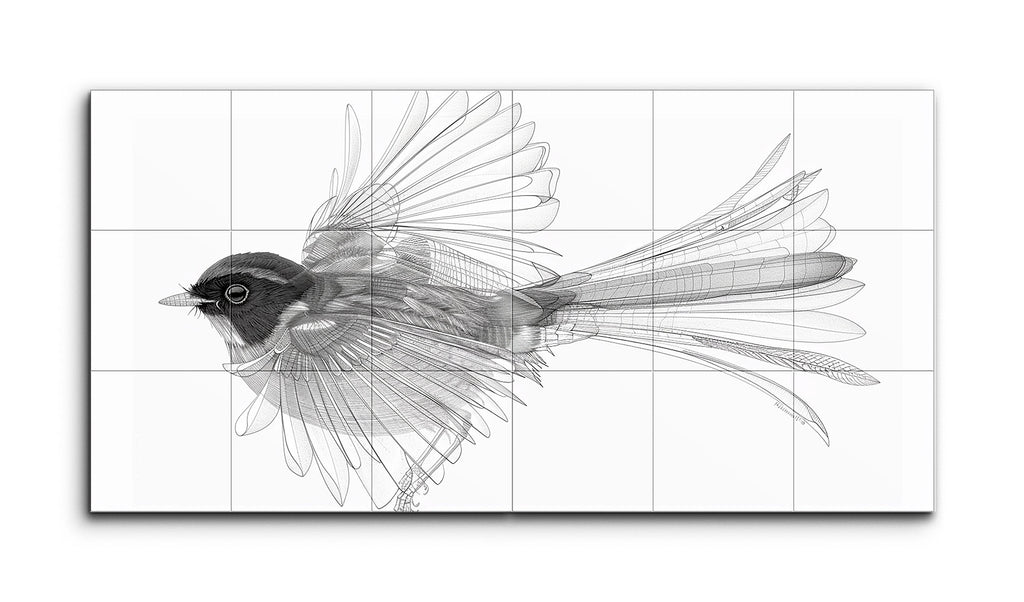 Questo murale di piastrelle presenta un uccello in volo, rappresentato con meticolosa attenzione ai dettagli e precisione. Realizzato in tonalità monocromatiche di nero e grigio, l'opera d'arte ricorda un disegno a wireframe o un blueprint. Ogni piuma e elemento anatomico è delineato con linee sottili, creando un senso di profondità e struttura. Le ali dell'uccello sono aperte, evidenziando intricati modelli di piume e meccaniche di volo. La testa è più solida e ombreggiata, fornendo un punto focale che contrasta con la rappresentazione lineare delle ali e della coda. Questo pezzo fonde illustrazione scientifica con disegno tecnico per un risultato visivamente sorprendente.