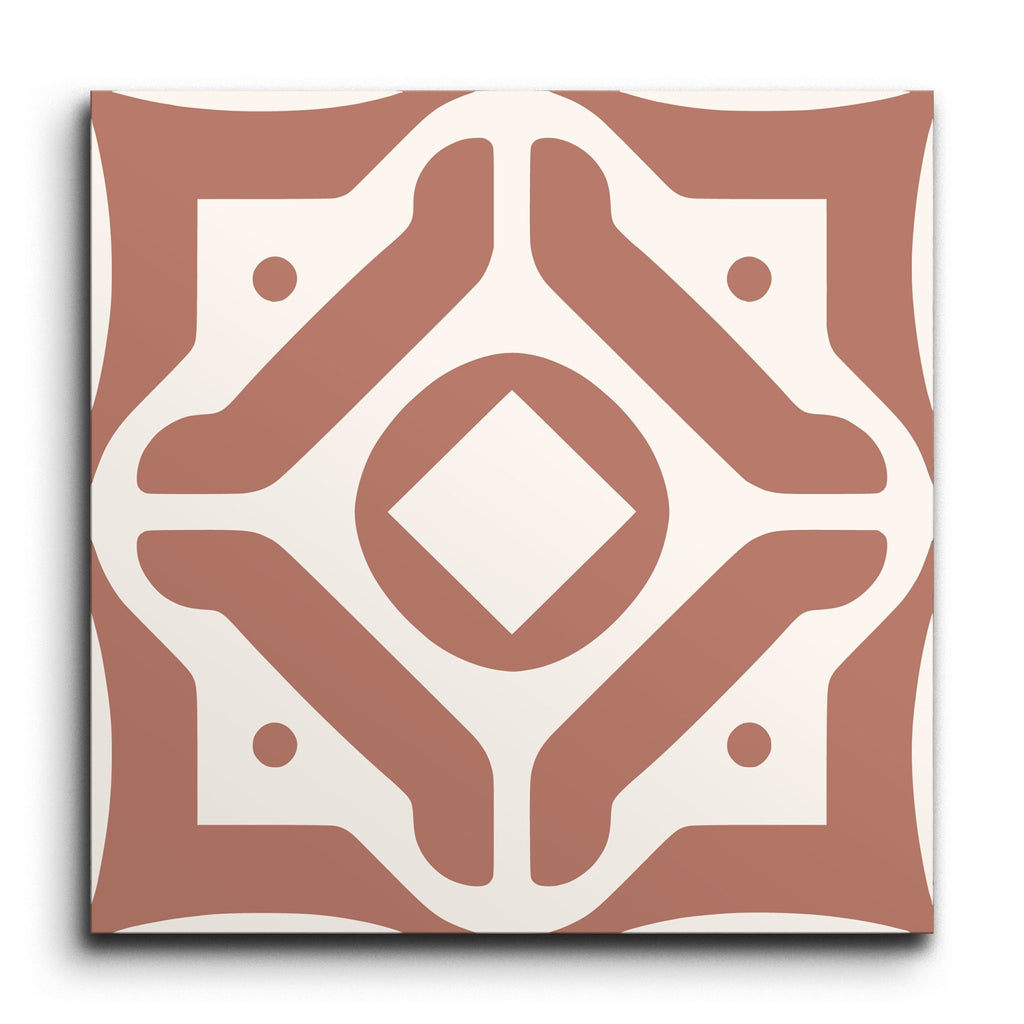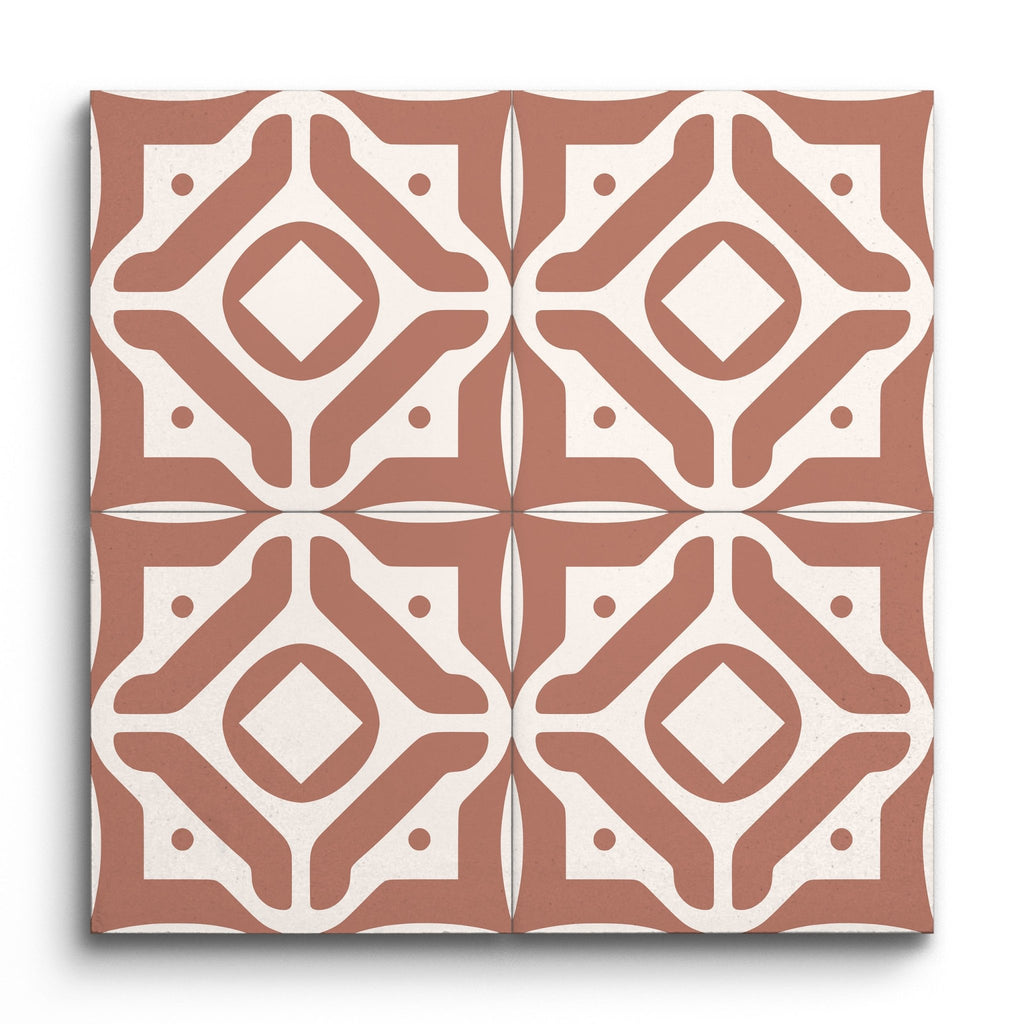 Questa piastrella decorativa presenta un affascinante motivo ispirato all'encausto, in cui un diamante centrale è incorniciato da una serie di forme geometriche intricate. La palette di colori in terracotta calda e bianco sporco le conferisce un aspetto terroso ma sorprendente. Con il suo design elaborato, questa piastrella porta un senso di fascino vintage e un tocco artistico a qualsiasi ambiente.