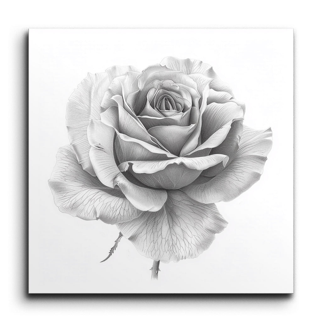 Immergiti nell'eleganza senza tempo del nostro murale in piastrelle in scala di grigi che presenta una rosa iperrealistica. Ogni petalo è meticolosamente ombreggiato, catturando la morbida e vellutata texture e le intricate venature con precisione. Il bocciolo centrale, compatto, si apre in petali esterni più grandi e arricciati, creando un sorprendente effetto tridimensionale. Le foglie e il gambo finemente dettagliati aggiungono alla qualità realistica. Centrato e classico, quest'opera d'arte celebra la bellezza naturale della rosa, invitandoti ad apprezzare la sua squisita maestria.
