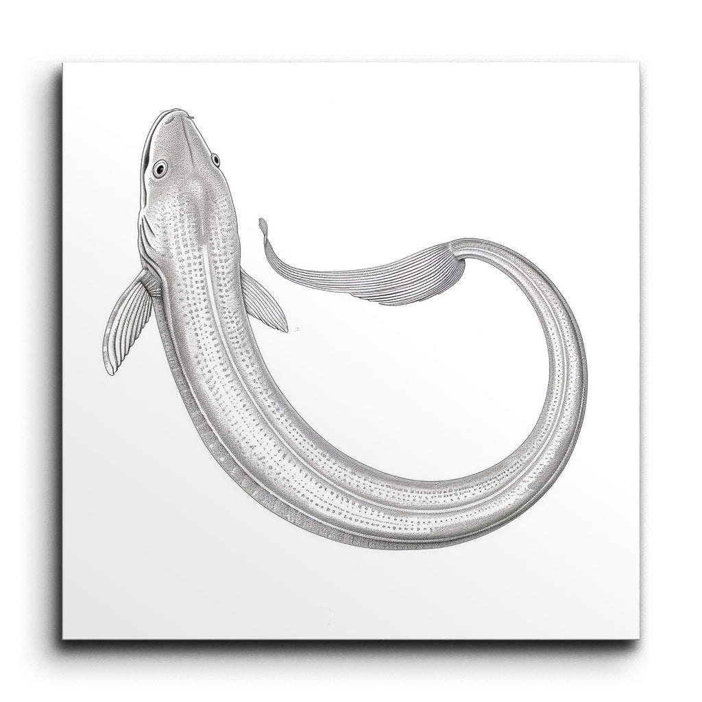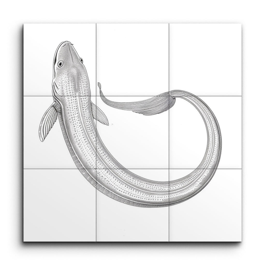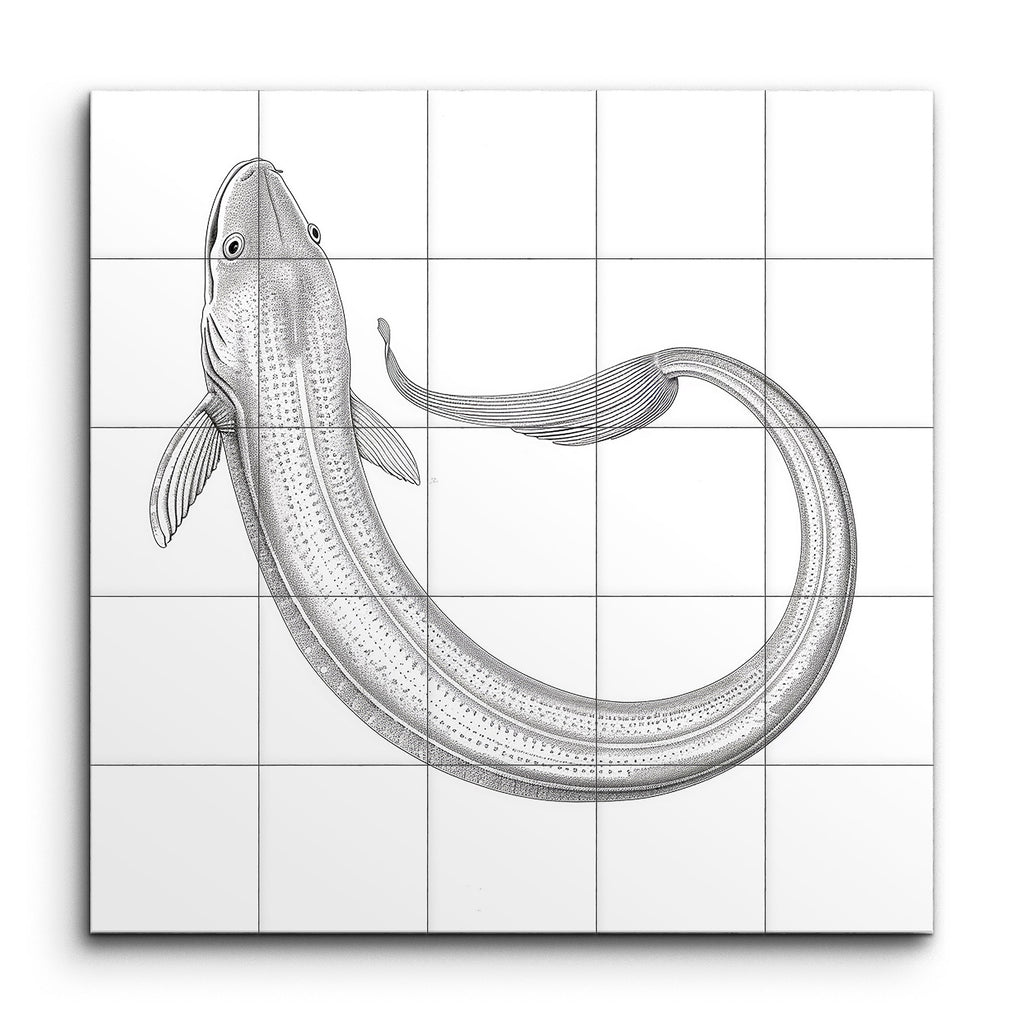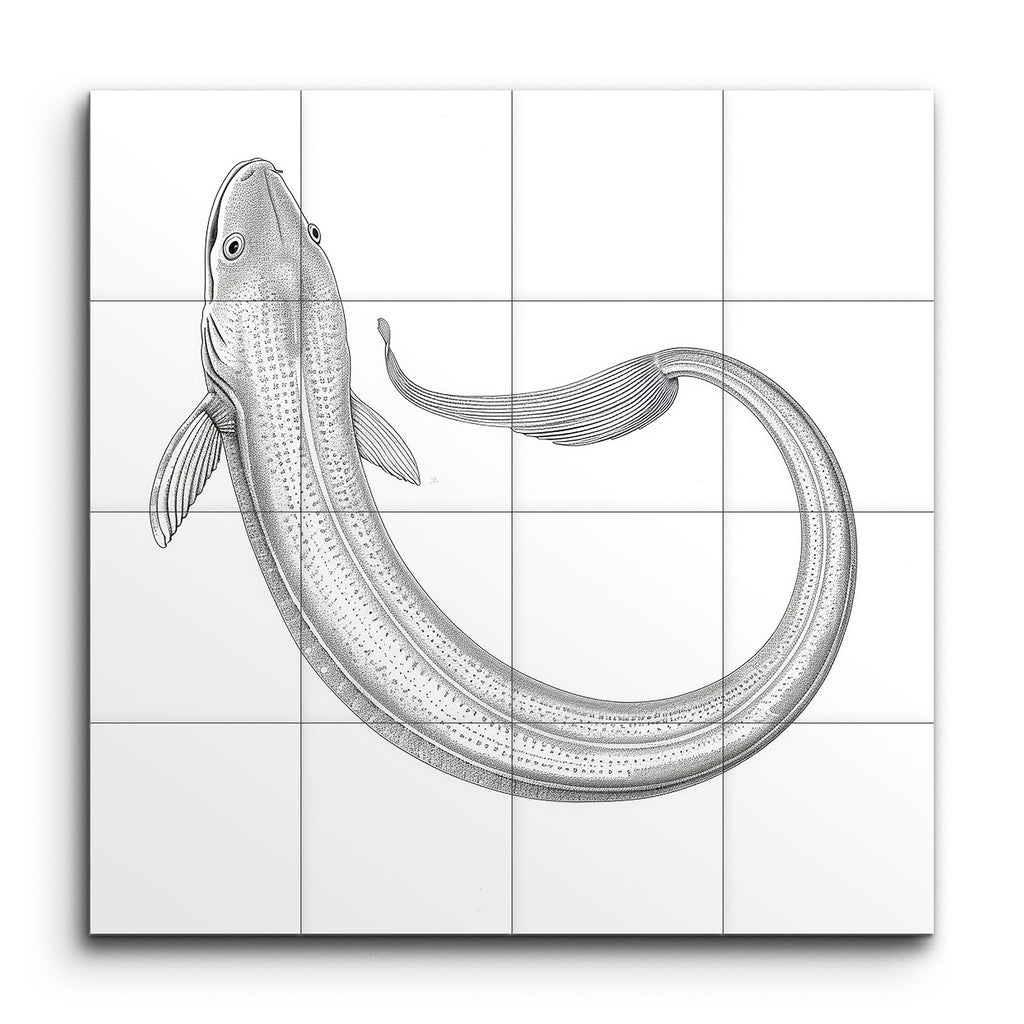 Immergi il tuo spazio nell'incantevole eleganza del nostro murale di piastrelle monocromatiche, che presenta un'illustrazione di pesce meticolosamente dettagliata. Il corpo serpentino, che si curva con grazia, evoca un senso di movimento fluido, mentre le linee sottili e l'ombreggiatura danno vita alle squame con un effetto testurizzato, quasi tridimensionale. Le delicate pinne semitrasparenti e un occhio realistico aggiungono un tocco di realismo, fondendo precisione scientifica con un tocco artistico per un'esperienza visiva affascinante.