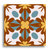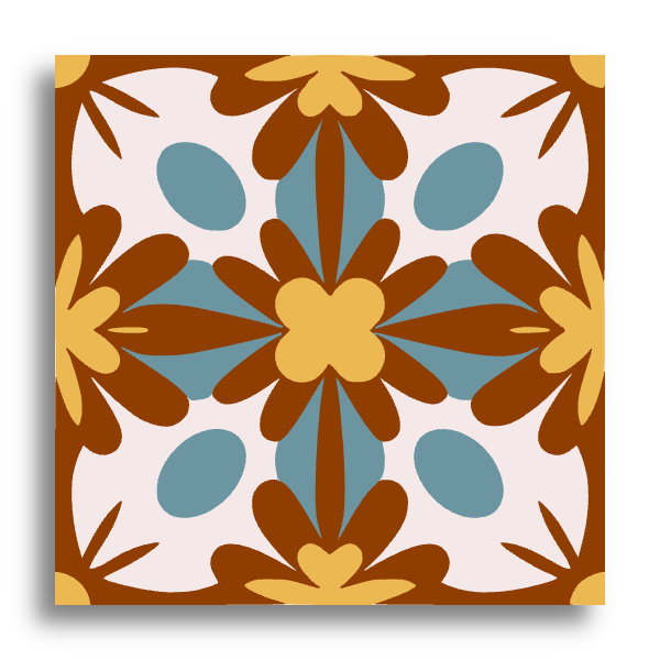 This decor tile showcases a charming encaustic pattern with a vintage touch. At its heart is a symmetrical floral motif, where delicate petal shapes emerge from a central flower. The palette combines soft, muted tones of navy blue, light blue, cream, and a warm orange, weaving together a harmonious and balanced design. Bold outlines and contrasting hues enrich the visual depth, capturing the timeless appeal of classic encaustic tiles.