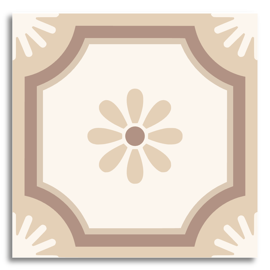 This decor tile showcases a captivating floral motif at its heart, where petal-like shapes elegantly extend from a circular center. Encased within a geometric border, the design achieves a harmonious balance and symmetry. The soothing shades of blue and beige create a timeless and serene ambiance, capturing the essence of traditional encaustic tiles with their intricate and decorative appeal.