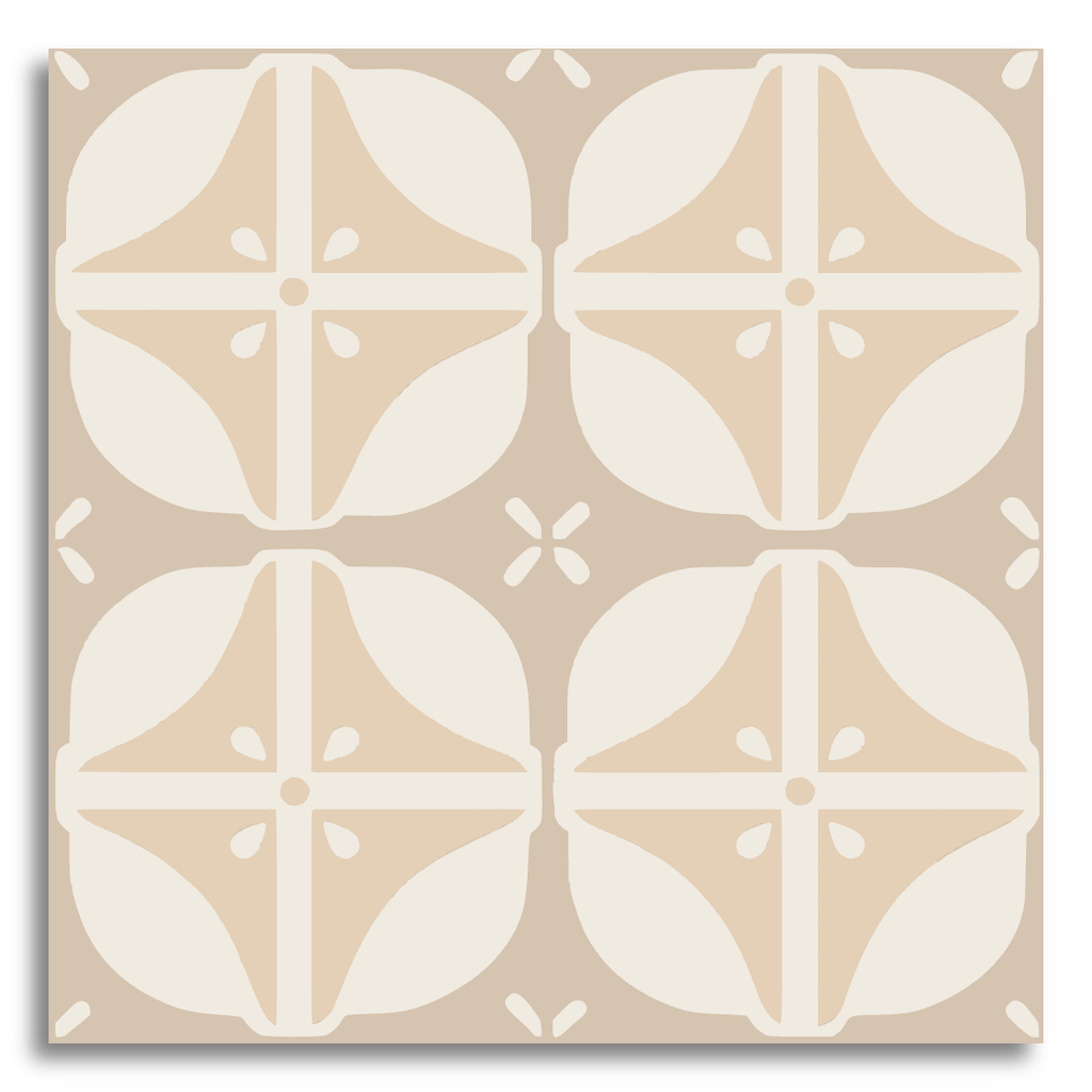 This decor tile showcases a beautifully symmetrical pattern set against a soft, muted pink backdrop. White geometric shapes intricately form a floral-like motif, combining petal and cross elements that bring a sense of harmony and balance. The design echoes the timeless allure of traditional encaustic tiles, celebrated for their artistic intricacy. The subtle and elegant color palette lends a sophisticated and classic charm, perfect for enhancing any space with a touch of refined style.