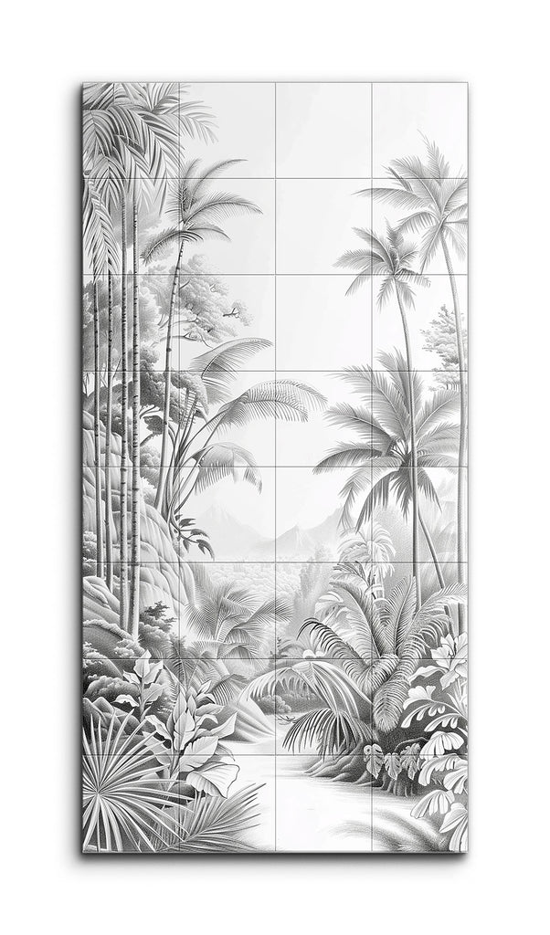 Questo murale in piastrelle presenta una lussureggiante scena di giungla tropicale in una palette monocromatica in scala di grigi. Alte e slanciate palme con fronde elegantemente arcuate dominano la parte superiore, aggiungendo altezza ed eleganza. Le sezioni centrale e inferiore sono riempite con piante a foglia larga e felci dettagliate in modo intricato, creando un ambiente denso e stratificato. Un sentiero tortuoso invita lo spettatore a addentrarsi nella giungla, con luci e ombre sottili che esaltano le forme naturali. Lo stile altamente dettagliato e realistico enfatizza la bellezza naturale e la complessità della giungla.