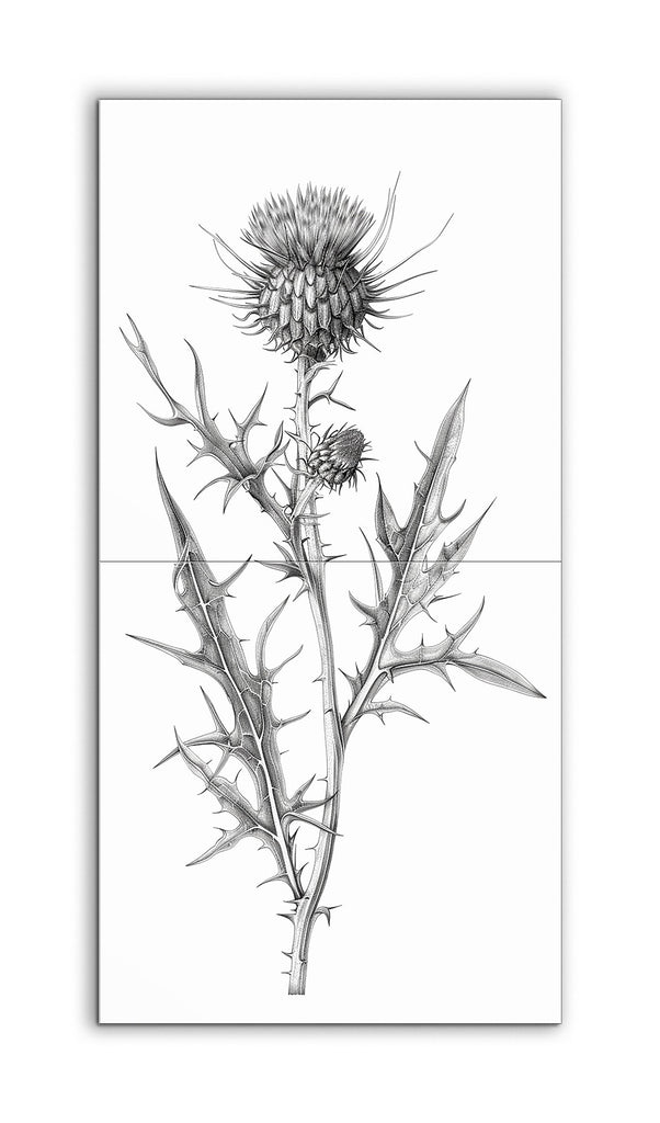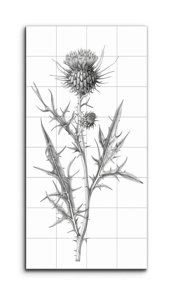 Questo murale in piastrelle presenta un'illustrazione botanica meticolosamente dettagliata di una pianta di cardo. L'opera è altamente realistica, con linee sottili e ombreggiature che conferiscono alla pianta un aspetto tridimensionale. Il cardo è rappresentato nella sua interezza, evidenziando la struttura intricata delle sue foglie, del gambo e del capolino. Il capolino, con le sue brattee spinose e i fiori densi, è messo in evidenza, mentre le foglie seghettate e il gambo spinoso contribuiscono all'impressione di resilienza della pianta. L'illustrazione in bianco e nero emana un'atmosfera classica e scientifica, che ricorda i tradizionali disegni botanici.