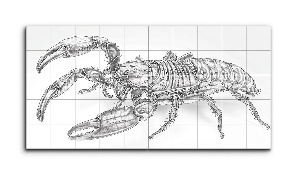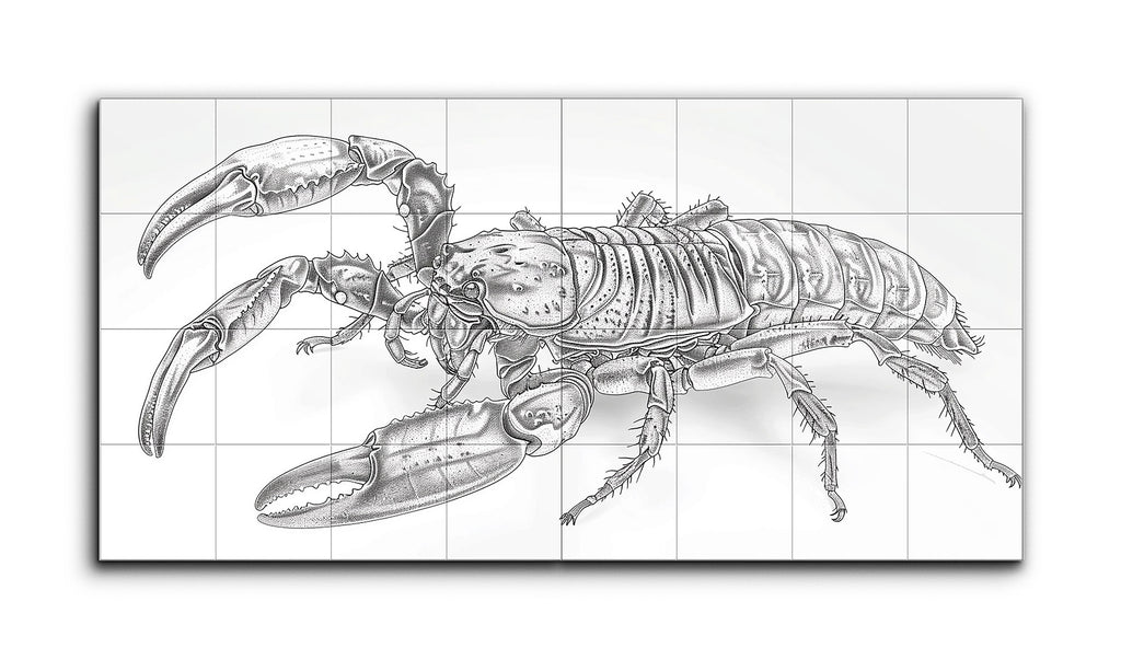 Questo murale di piastrelle presenta un'illustrazione altamente dettagliata di un'aragosta, che ricorda uno studio scientifico. Realizzata in scala di grigi, l'opera cattura le complessità dell'esoscheletro dell'aragosta, del corpo segmentato e della forma texturizzata. L'artista utilizza tecniche di ombreggiatura come il puntinismo e l'incrocio delle linee per creare profondità e realismo. Ogni gamba, antenna e chela è meticolosamente lavorata, enfatizzando la complessità e la bellezza naturale dell'aragosta. Questo pezzo è un tributo alla precisione e all'eleganza dell'illustrazione scientifica.