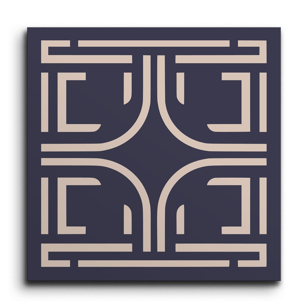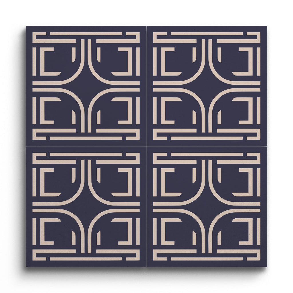 La piastrella decorativa presenta un affascinante motivo geometrico con forme intrecciate che fondono linee curve e rette in un motivo armonioso. Su uno sfondo blu navy profondo, il design presenta linee di colore beige chiaro o crema che creano un contrasto sorprendente, mettendo in risalto l'estetica moderna e minimalista. Le linee pulite e la struttura equilibrata di questa piastrella la rendono una scelta sofisticata per qualsiasi spazio contemporaneo.