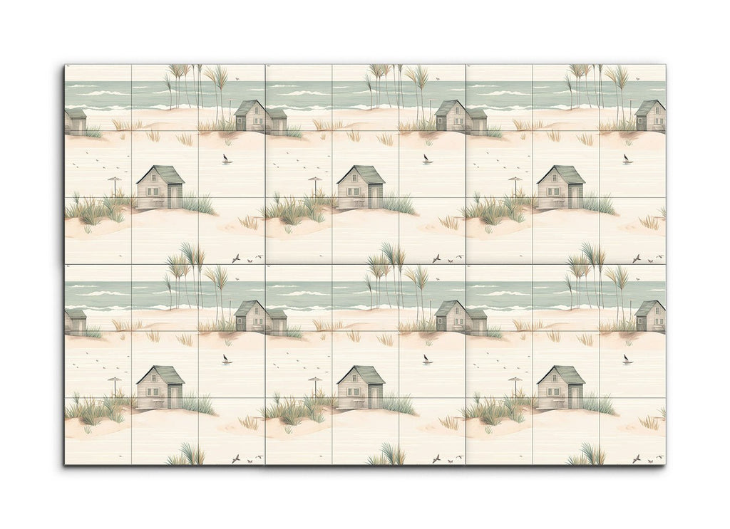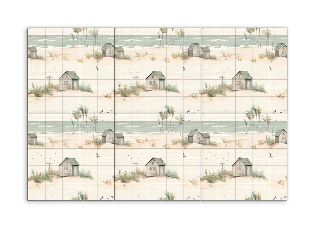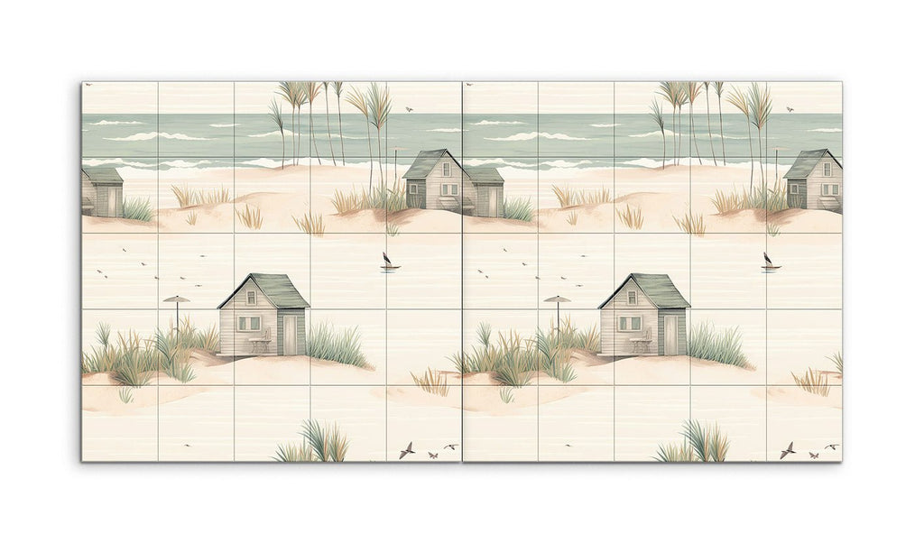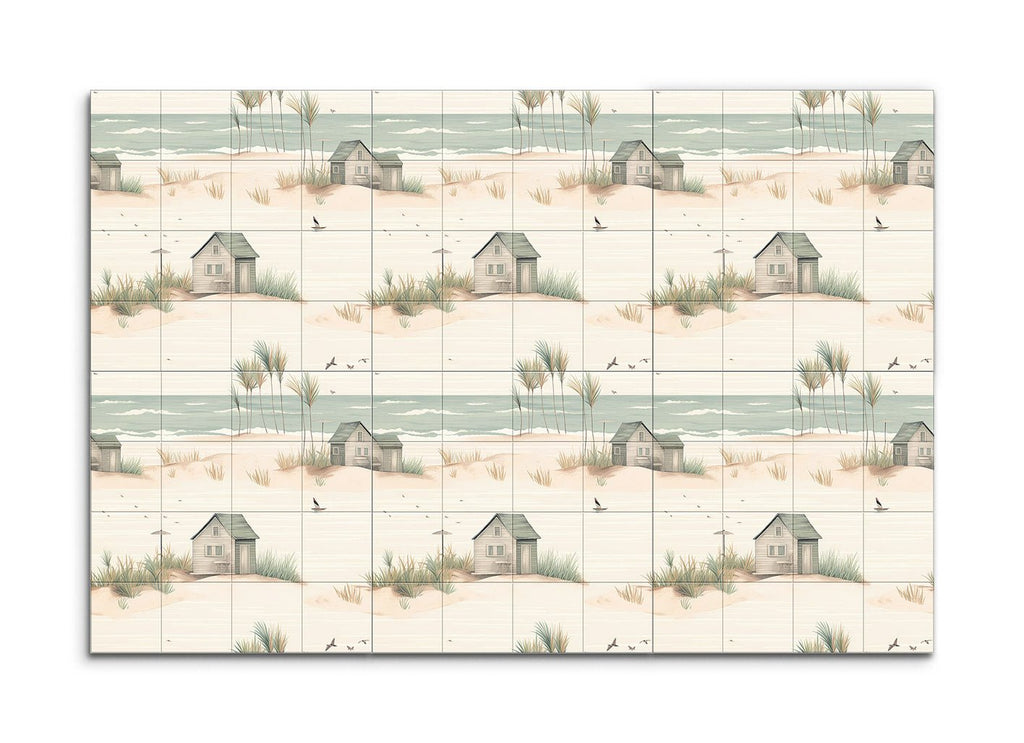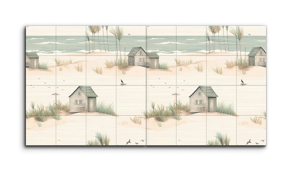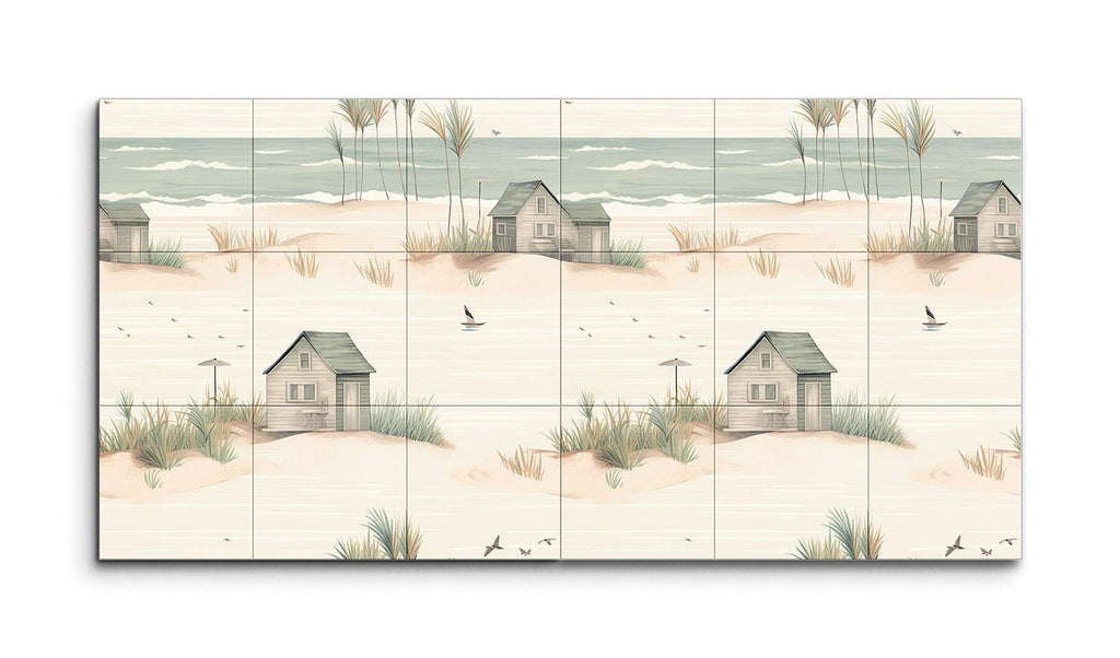 Trasforma il tuo spazio con questo incantevole murale in piastrelle, che presenta una serena scena costiera che cattura l'essenza di un tranquillo rifugio sulla spiaggia. L'opera d'arte minimalista e fantasiosa mostra una spiaggia sabbiosa adornata con dolci dune, ciuffi d'erba sparsi e affascinanti capanne da spiaggia rustiche in toni pastello tenui. Toni di beige soffice, verde chiaro e blu pallido creano un'atmosfera da sogno, mentre linee delicate ed elementi armoniosi evocano un ambiente pacifico e idilliaco. Perfetto per portare un tocco di calma costiera in qualsiasi stanza.